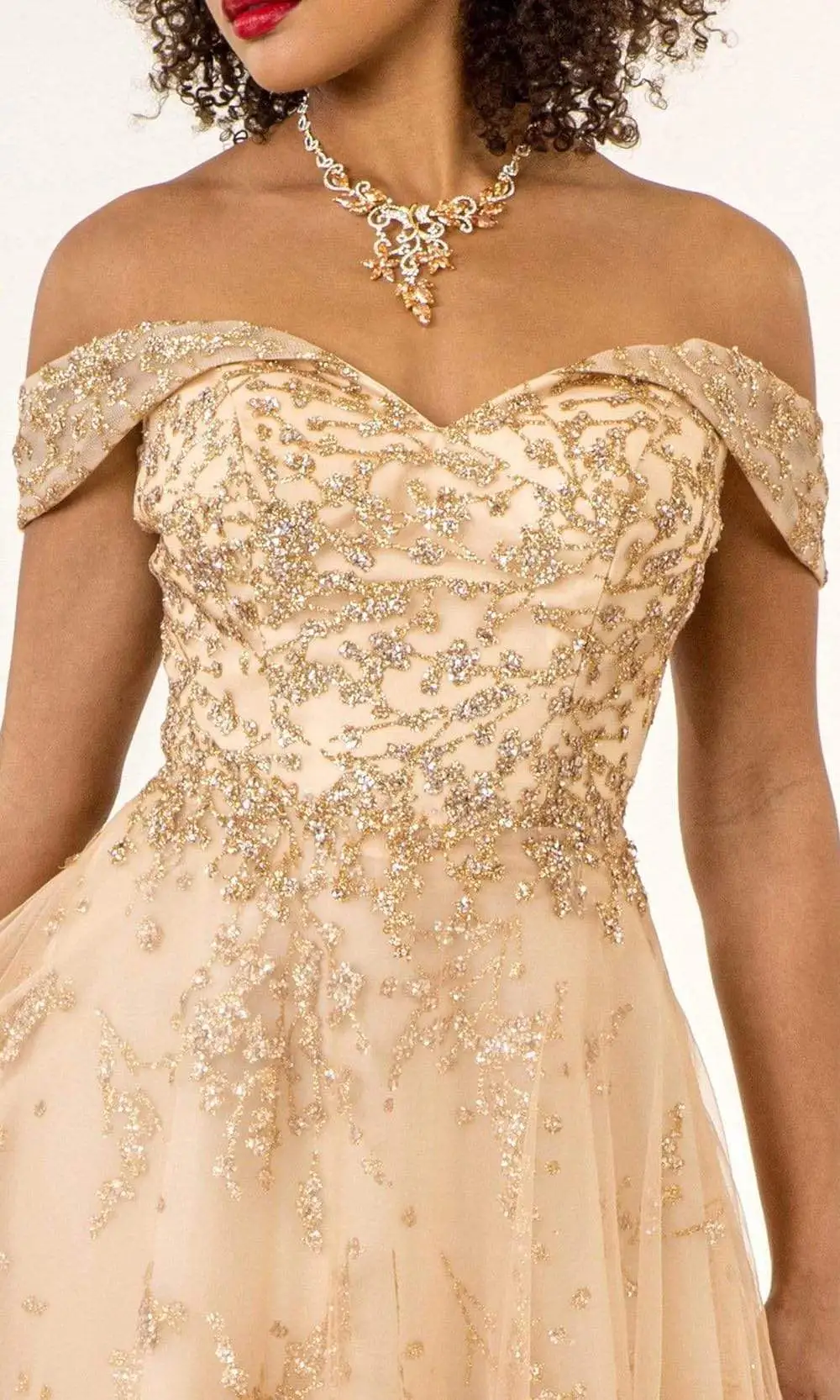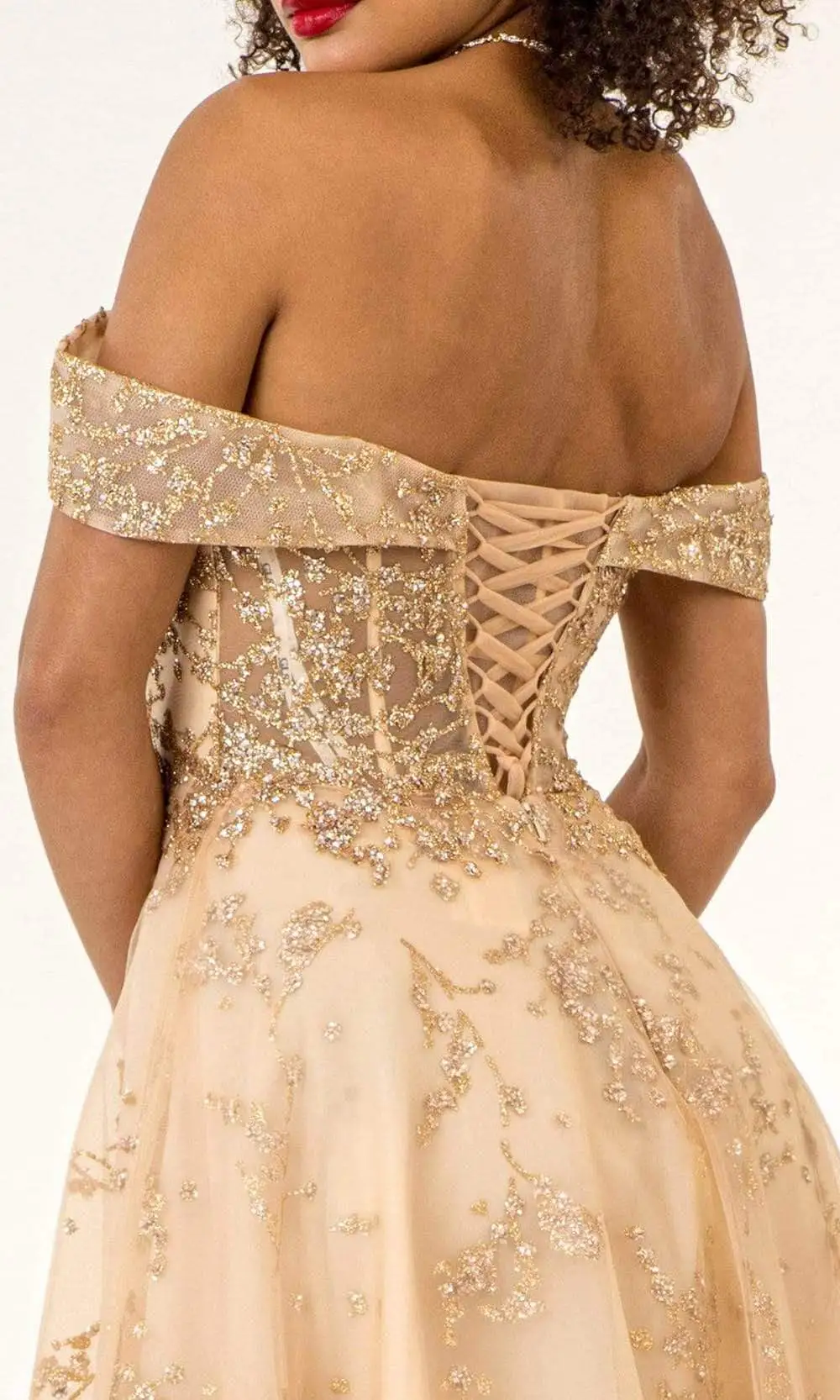 Make them look in this lavish gown by GLS by Gloria GL1922. Adorned with trailing glitter print, this mesh gown features an off-shoulder neckline with a sweetheart notch, princess seam fitted front bodice, while the back showcases a sheer corset inspired style with lace-up details. The A-line skirt cascades into full-length with a sheer layer for added dimension. Have an enchanted evening at the ball in this gorgeous gown by GLS by Gloria.