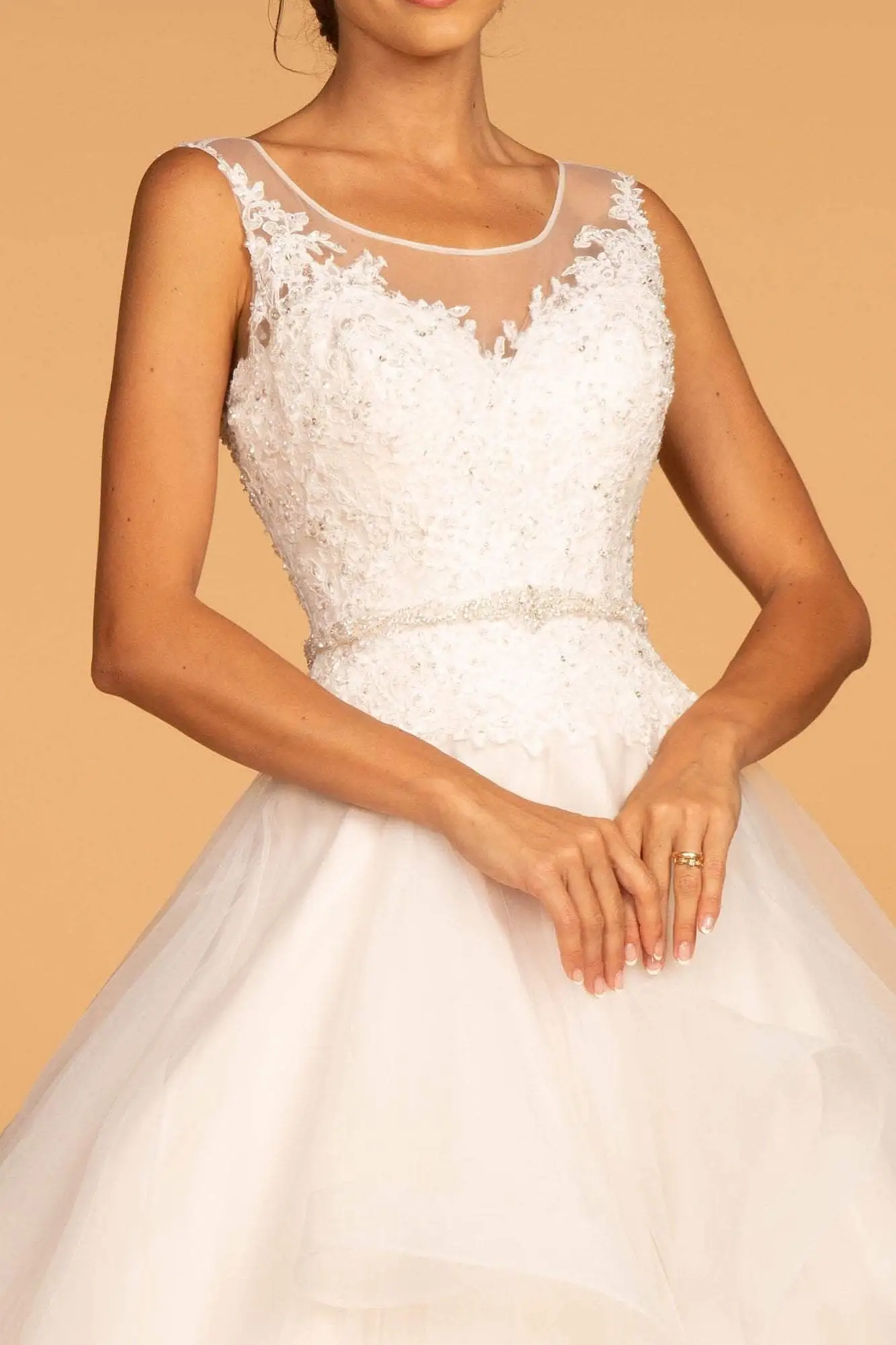 Beam with pride when you wear this radiant gown from GLS by Gloria GL2599. Brandishes in a sleeveless, illusion scoop neckline with sweetheart bodice ornate with embellishments and lace appliques. The back is styled with a trail of covered buttons while the tulle skirt is designed in ruffles with horsehair hemline. This GLS by Gloria dress has a striking look that’s sure to make anyone remember your grand entrance.