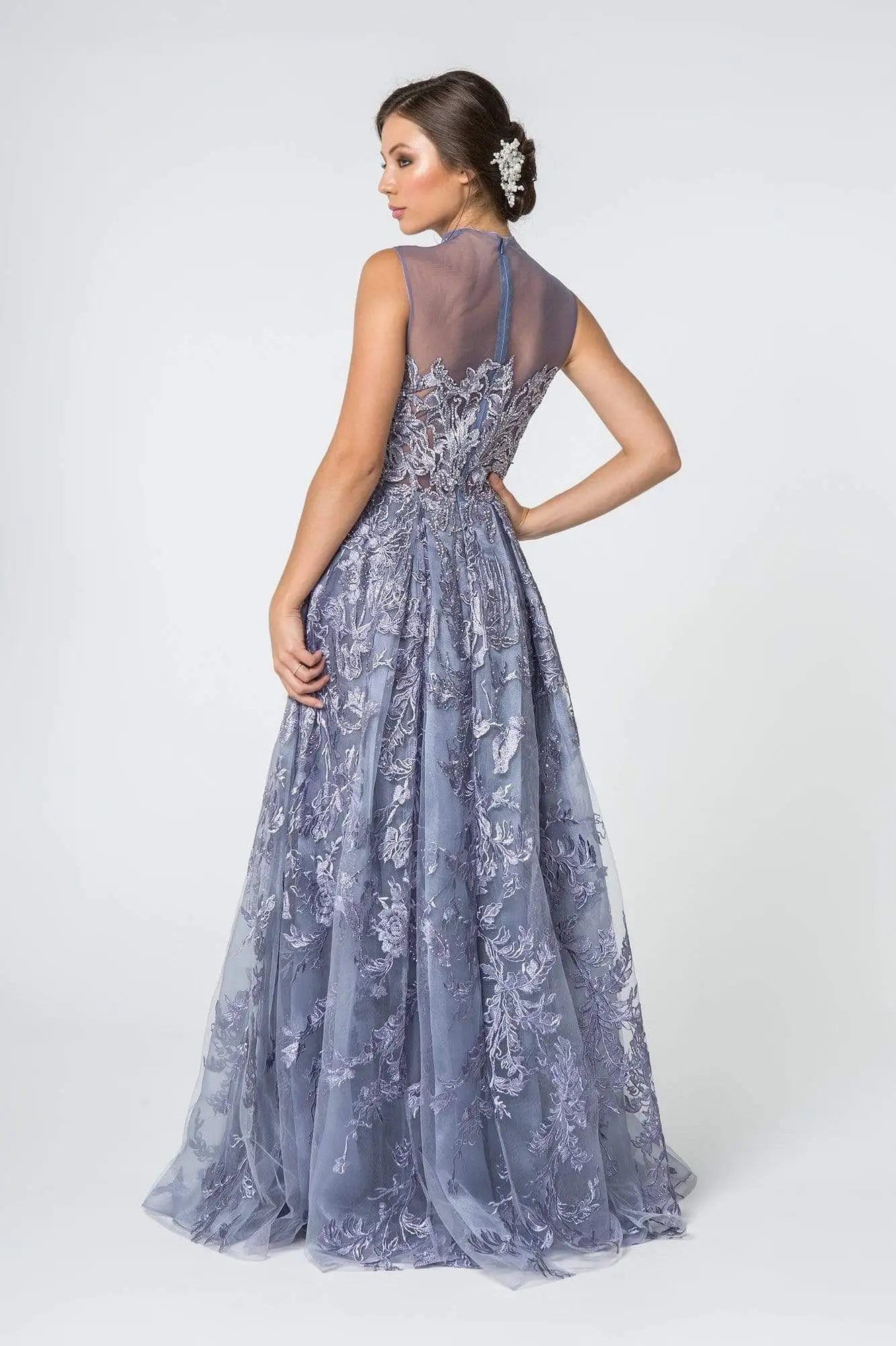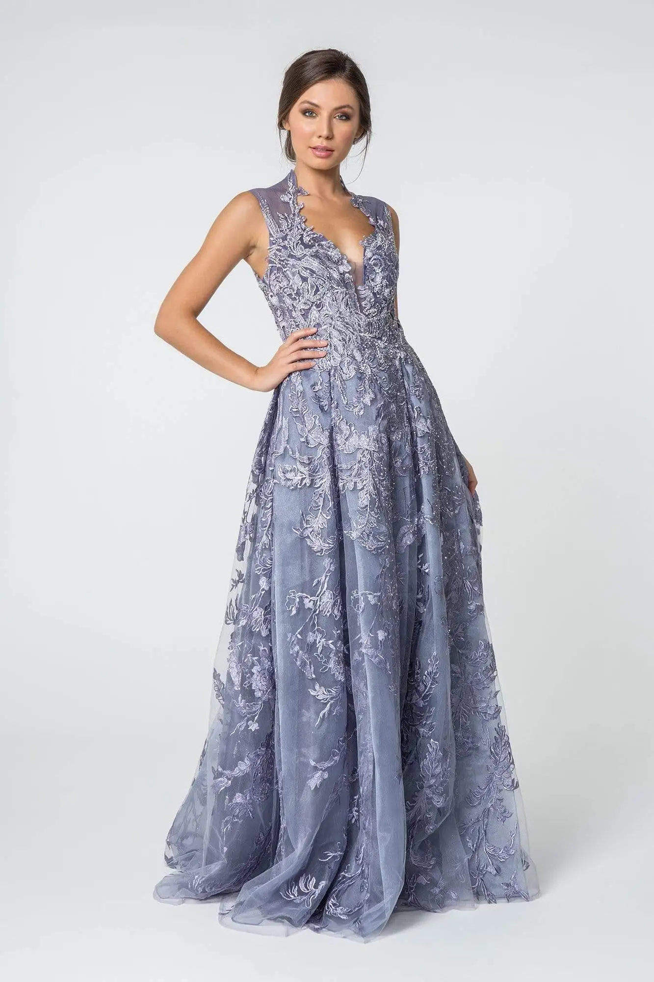 Be ready to fascinate everyone in this dress by GLS by Gloria GL2836. This embroidered dress enchants in a sleeveless, deep V-neckline with sheer inset. It has a flattering fitted bodice and a zipper closure. The skirt fashions a full length A-line silhouette. This GLS by Gloria dress is perfect on your next formal event!