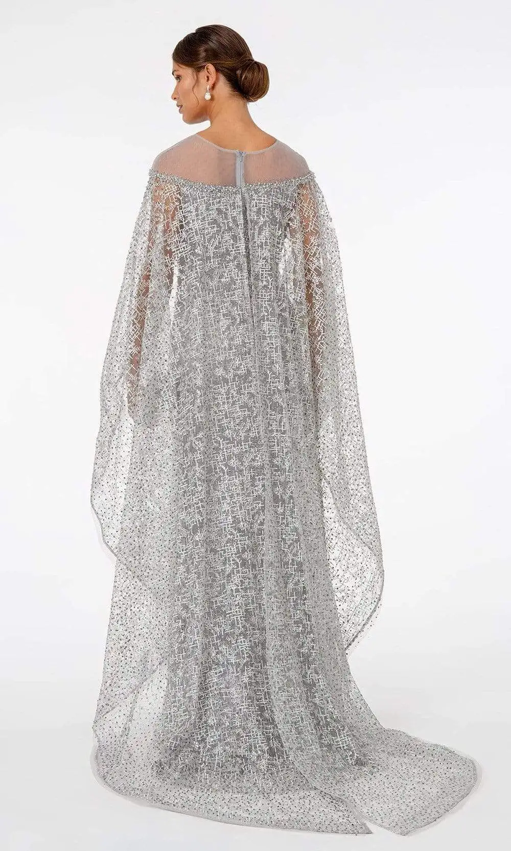Make a grand entrance in this embellished lace long cape sleeves floor Length dress by Elizabeth K GL2977. It is designed with Embellished Lace appeals in a jewel neckline with a fitted bodice. A zip is added in the back for a comfortable fit. A cape is attached in order to add drama and the trumpet fitted skirt for the glamorous look.