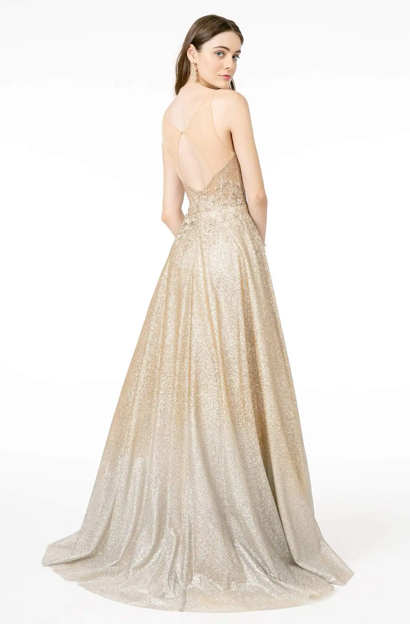 | Details: | Sleeveless, Glitter ombre, Plunging neckline, A-line skirt, Back keyhole, Back zipper, Sweep train |