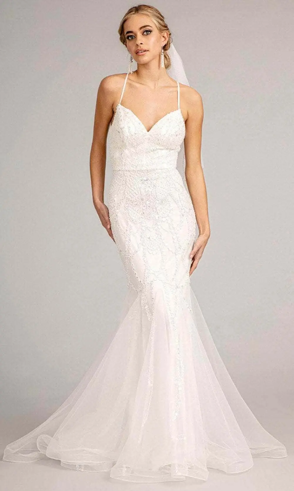 Lavish in the sparkle in his eyes as you walk down the aisle GLS by Gloria GL3009. The whole dress ensemble is designed in embroideries of jewels and sequins that perfectly radiates an glamorous look as the fitted bodice features a sweetheart neckline. Spaghetti straps lend support to the top as it leads to crisscross strappy back secured with a center zipper closure. The skirt showcases a mermaid silhouette which falls to a full length hemline. This design by GLS by Gloria is all set to make that your evening extra special!