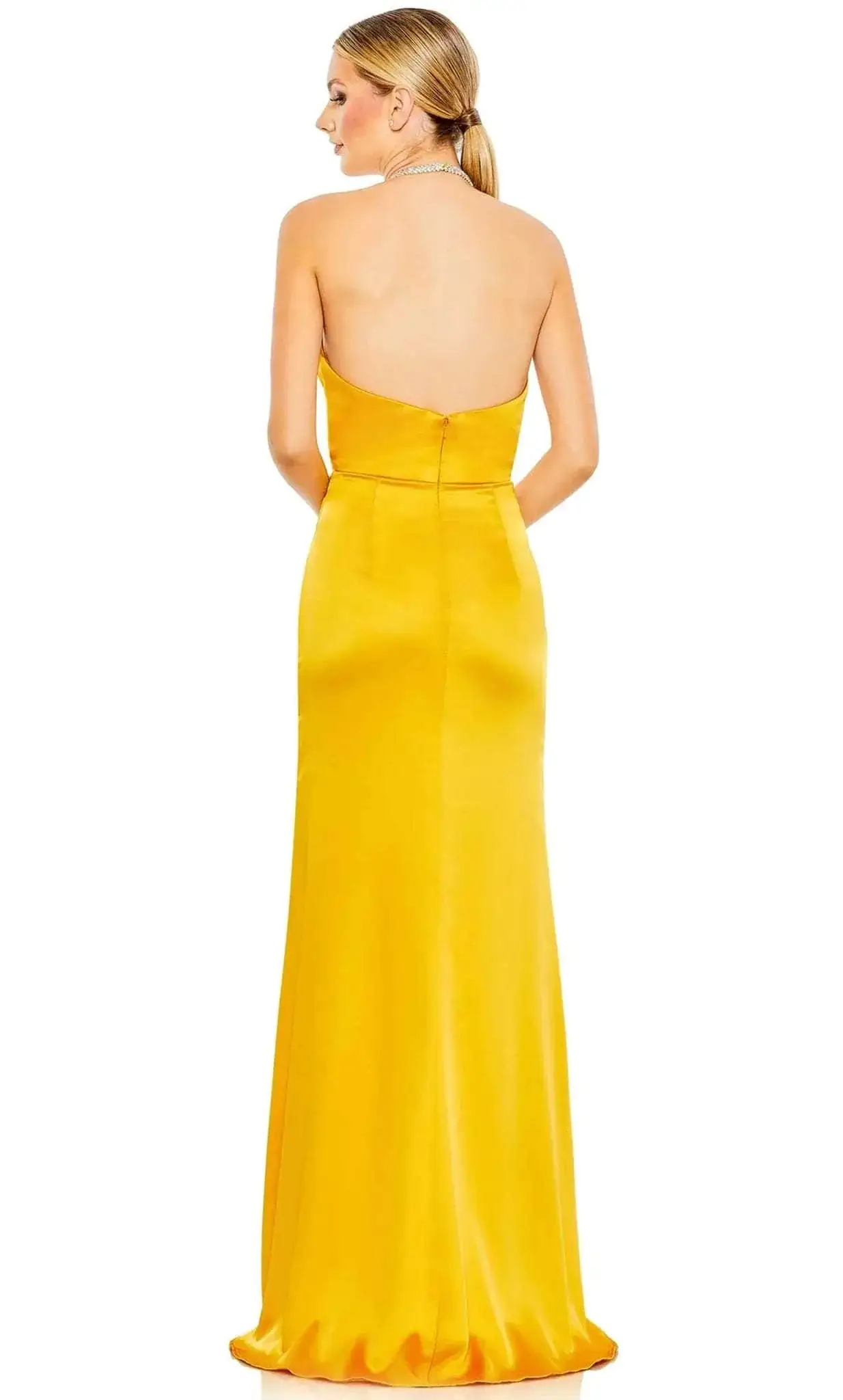 Become the center of attention in this Mac Duggal 26894 creation. Wearing this charming dress made of satin fabric will make you feel enchanted. It features an open back secured with a center zipper closure and a sleeveless bodice crowned with a V-neckline and supported by a rhinestone embellished strap. The slit accented skirt touches the floor has a small train at the end and parades in a sheath silhouette. Look exquisitely feminine wearing this Mac Duggal 26894 creation. Model is wearing Marigold color.
