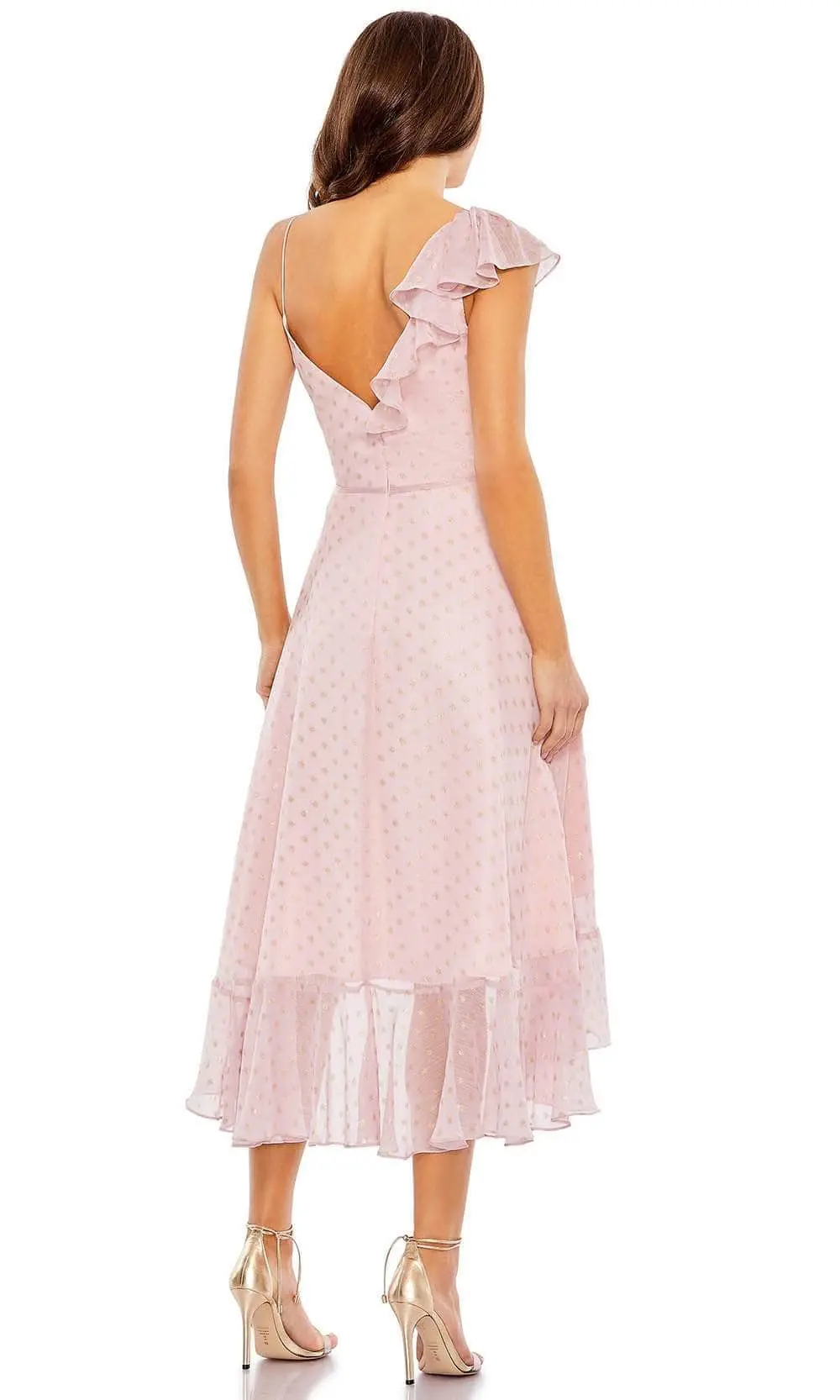 | Details: | Ruffled Trim, Cap Sleeve, Thin Strap, Polka Dot Glitter Embellishment, V-Back, Back Zipper, High-Low Hem |