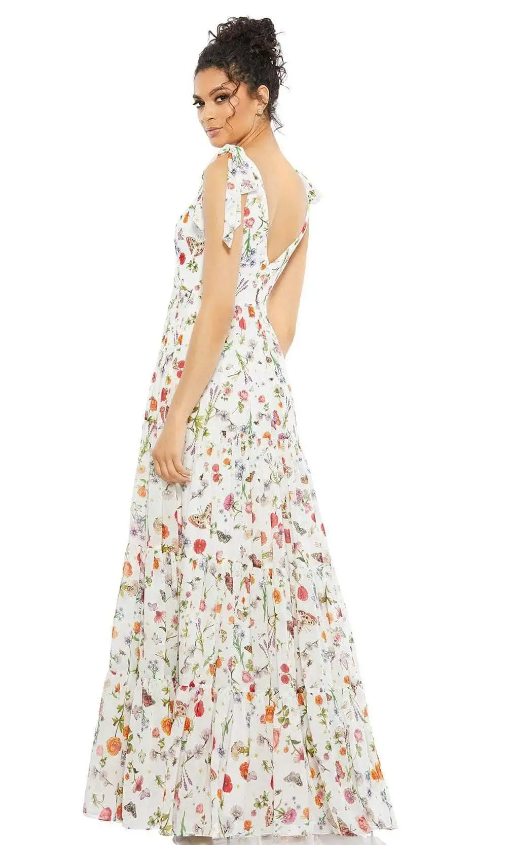 Look lovely in this timeless Ieena Duggal dress. This full length dress showcases a V-neckline in a floral printed bodice. The skirt reveals an A-Line silhouette while the back shows a V back with back zipper closure to complete the look. Have a blast in this fashionable Ieena Duggal creation. Model is wearing White and Multi-Color.