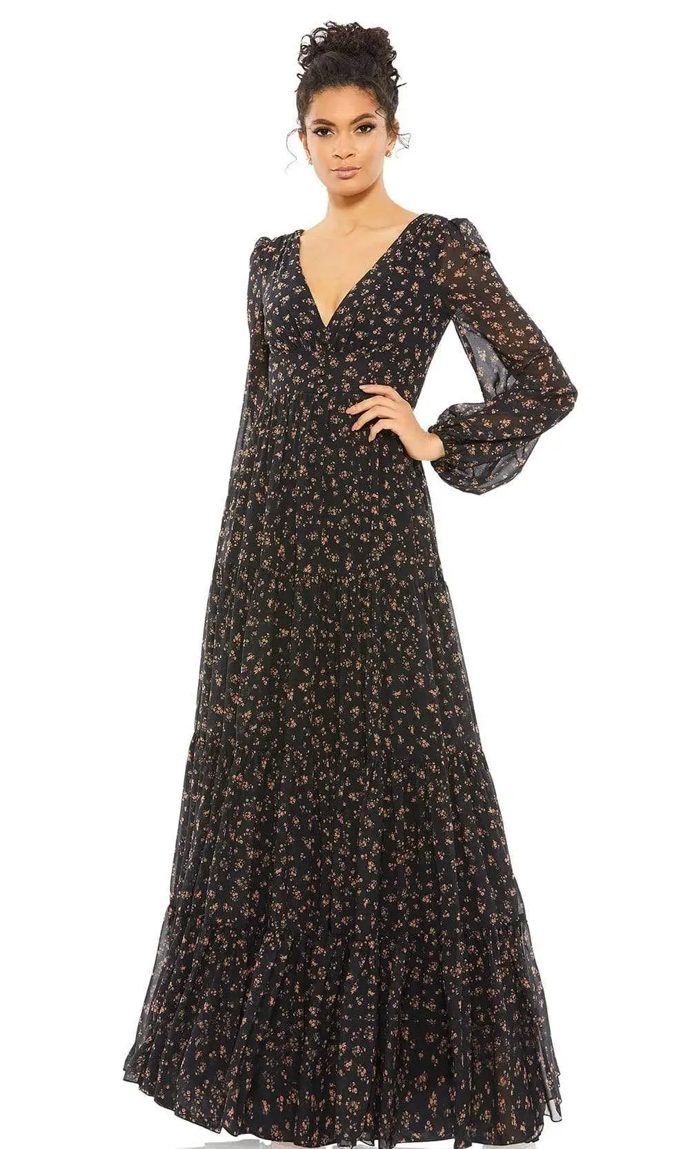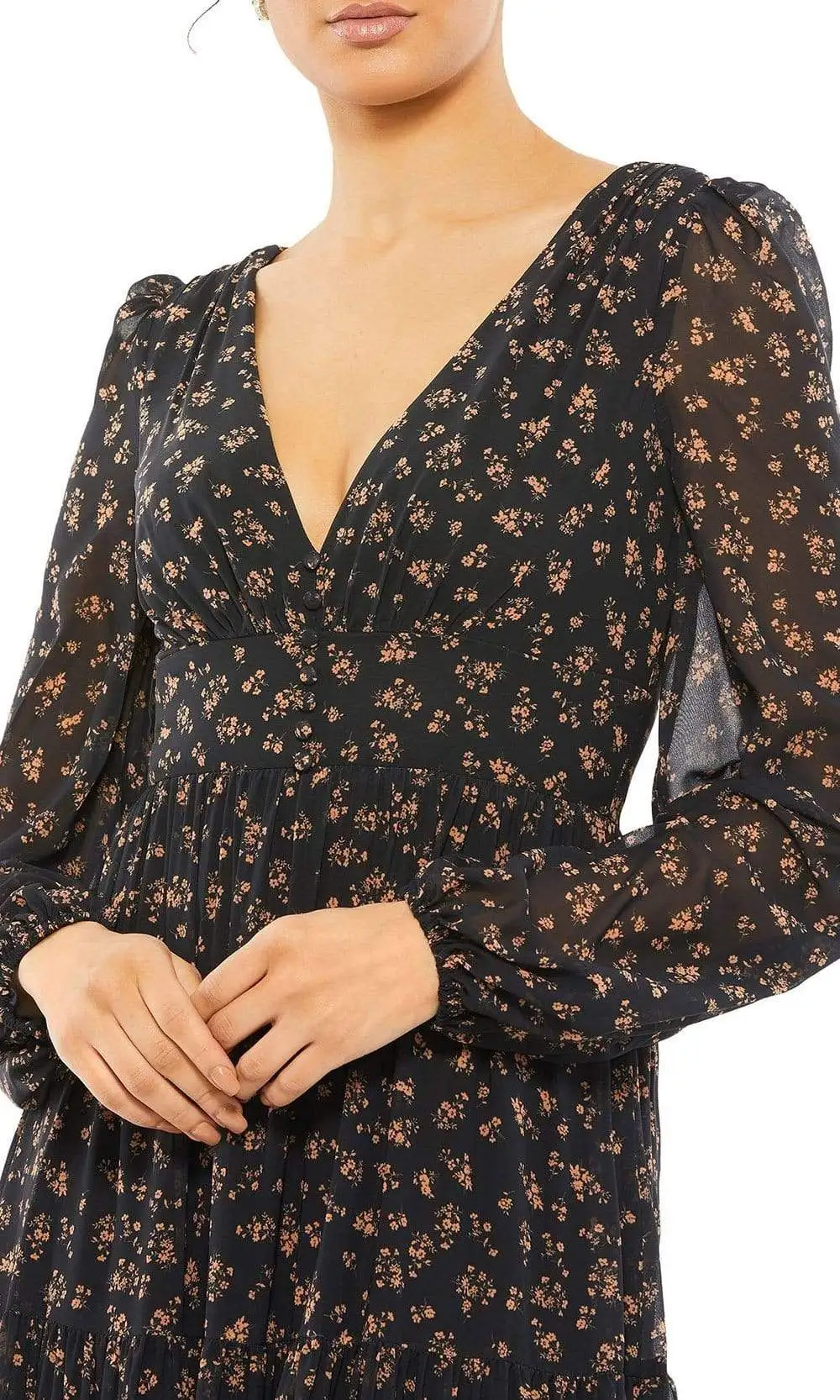 Capture the charm as you walk on this Ieena Duggal 55431 dress. This dress highlights a V-neckline supported by long sleeves in a floral printed bodice with an empire waist. The skirt reveals an A-line silhouette while the back shows a full back with back zipper closure. Breeze through your special day while making a stylish statement in this Ieena Duggal masterpiece. Model is wearing Black and Multi-Color.