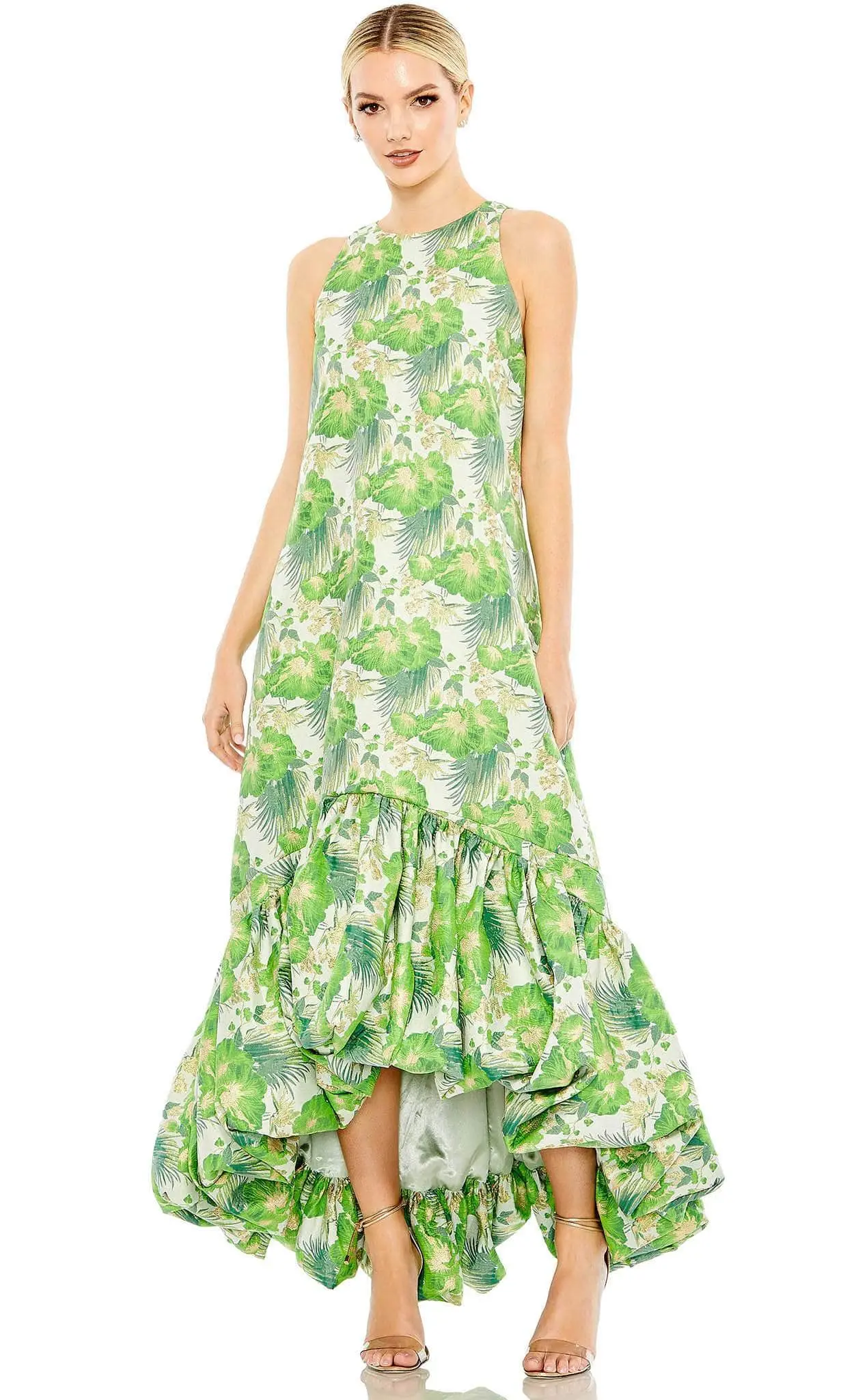 | Details: | Floral, Print, Ruffled, Sleeveless, Back Zipper, Full length |