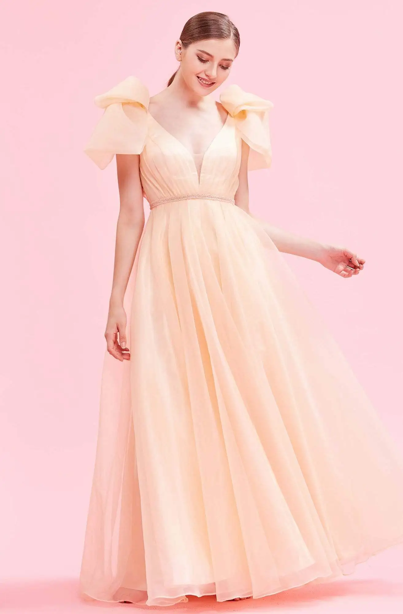 Be the belle of the ball when you tantalize in this J’Adore J16045 creation. Showing off soft ruching along its bodice, this beauty shows a plunging v-neckline with a sheer inset. Draped with oversized bow accents on the shoulders, the back dips into a v-open back. A tonal beaded band embraces the waist. The flowing organza skirt cascades into a full length hemline just above the floor. Set your sights at the top of the best-dressed list in this J?ÇÖAdore masterpiece. Models are wearing the Peach, Navy and Pink colors