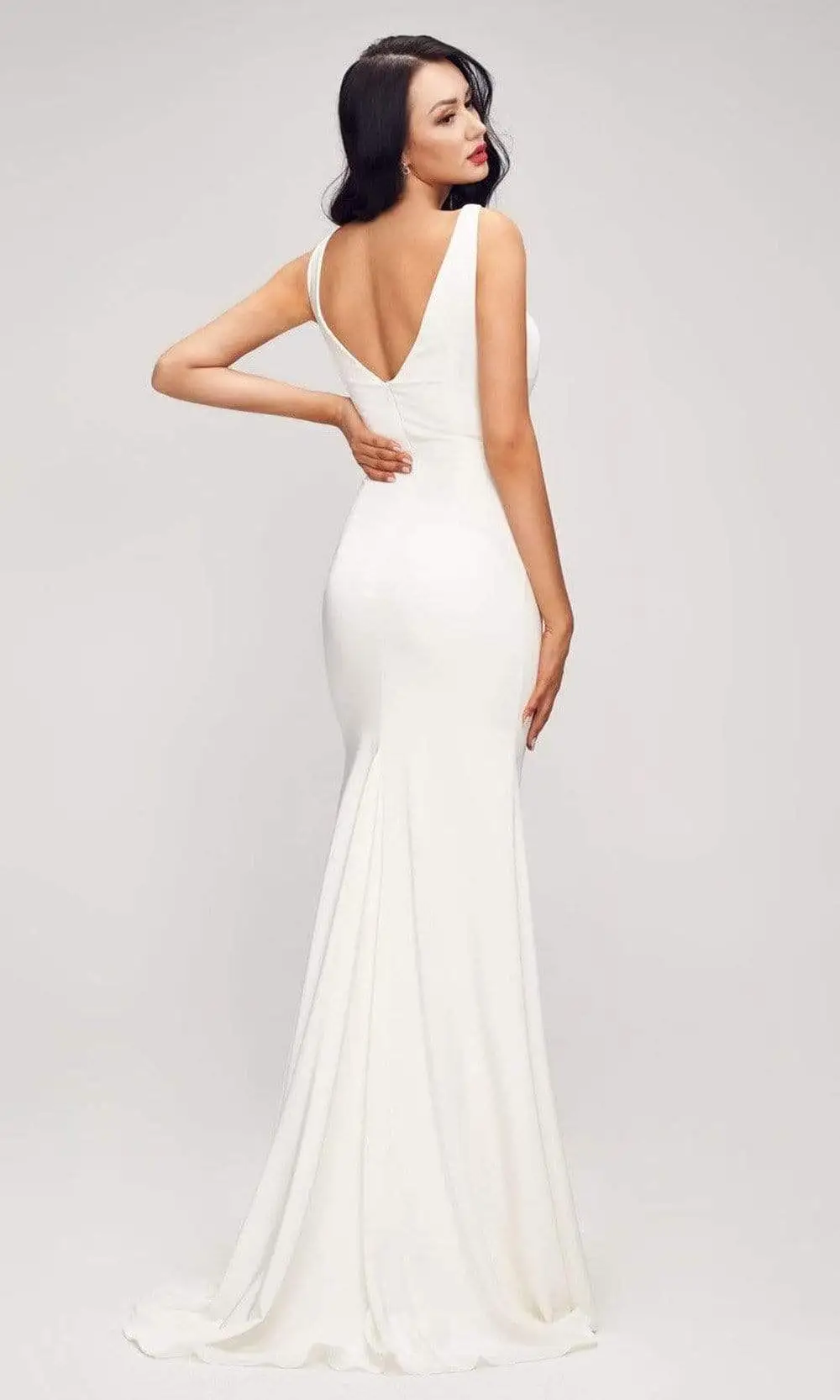 Look jaw dropping in this dramatic gown by Jadore J17013. This beautiful dress is made with crepe fabric and features a V neckline illusion neckline on a fitted bodice. It parades a full length sheath silhouette and has a V-cut back style. Make it a romantic occasion with this dress by Jadore.