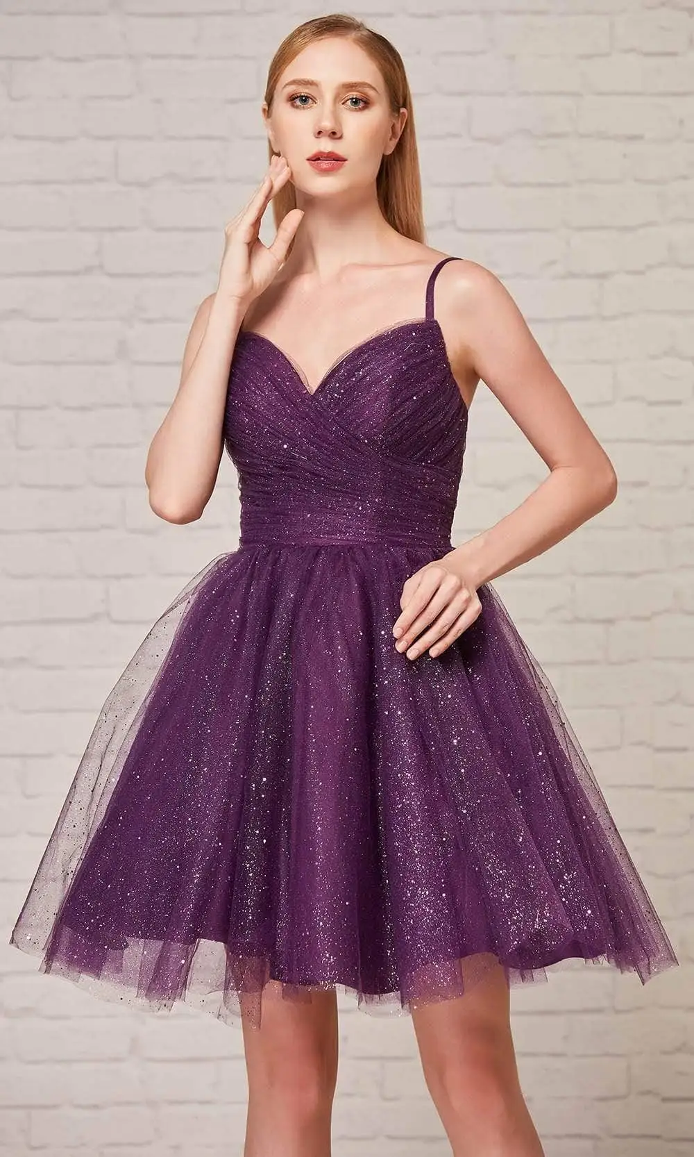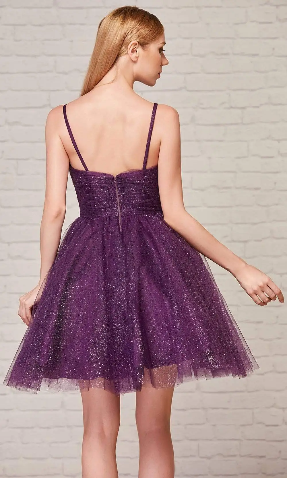 | Details: | Fully Glitter, Fitted, Sleeveless, Spaghetti Straps, Pleated Skirt, Mid-Thigh Length |