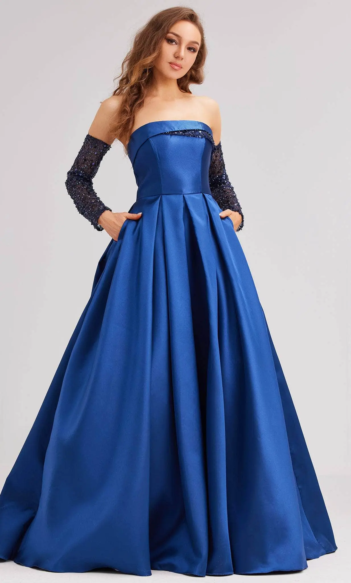 Sparkle as you walk into that lavish event in this stunningly made J’Adore Dresses J23003 creation. Rendered with tailoring lines on a luxurious Mikado silhouette, this stunner features a strapless bodice with a straight-across neckline. Detailed with a foldover accent and trimmed with tonal embellishments, this ensemble is styled with a lace up detail at the back, the pleat ornate skirt crafts a ballgown silhouette with a sweeping denouement. Express a style that flourishes beauty and sophistication in this J’Adore Dresses J23003 masterpiece. Models are wearing the Blue, Ivory and Navy colors.