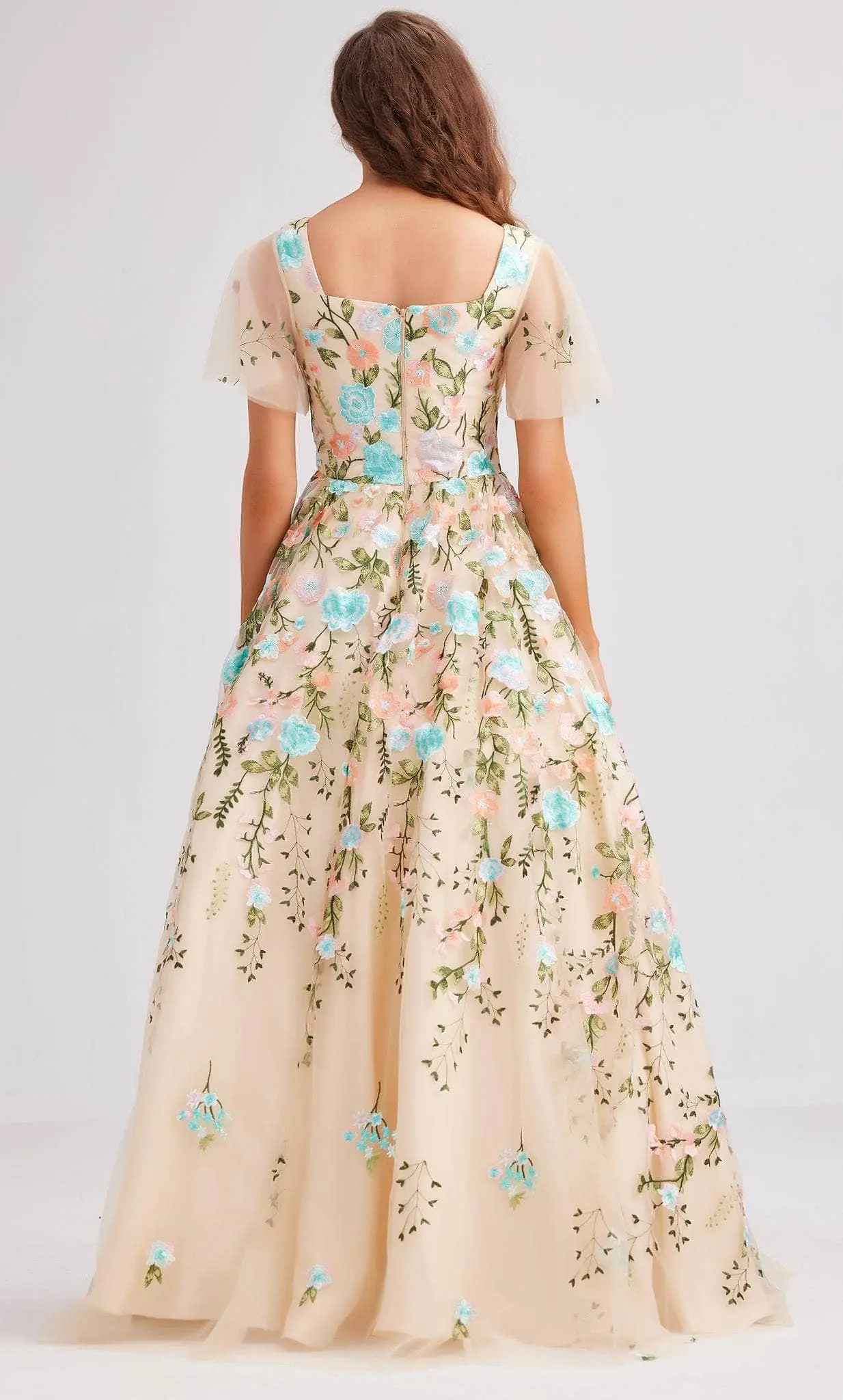 | Details: | Sheer Flutter Sleeves, Floral Embroidered, Square Open Back, Zipper Closure, Floor Length Hem |