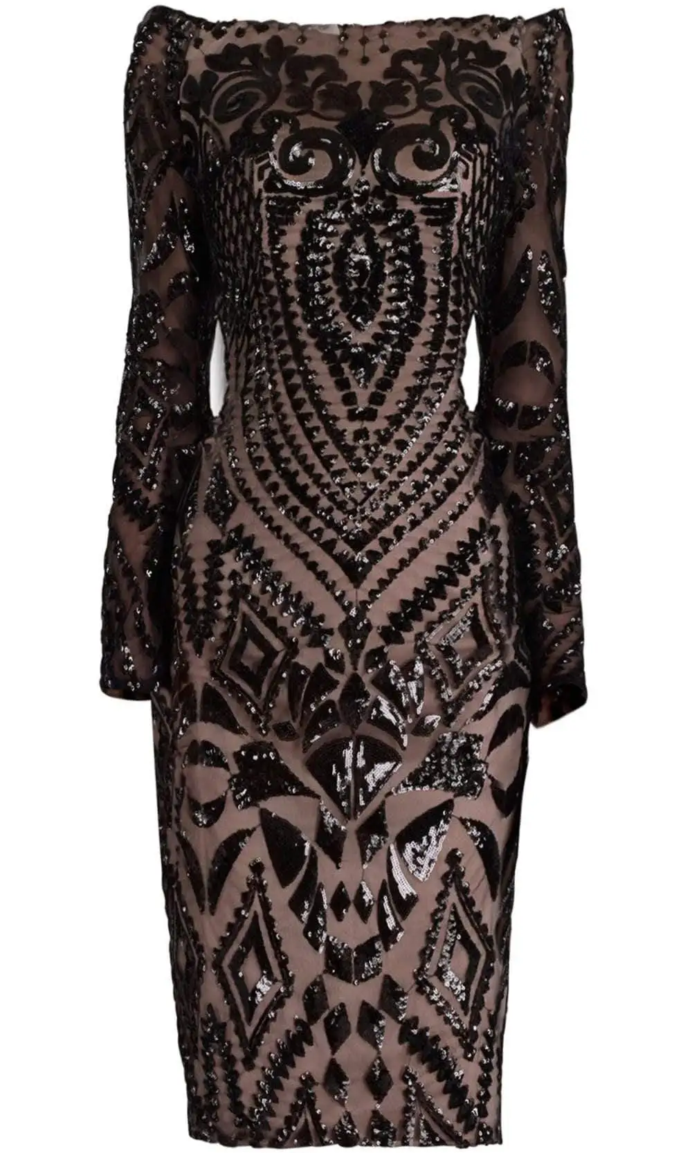 | Details: | Long sleeves, Sheer fabric, Sequins, Fitted bodice, Sheath skirt |