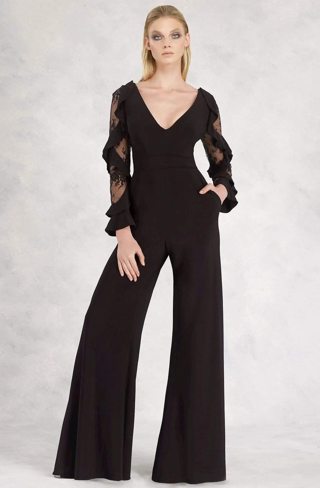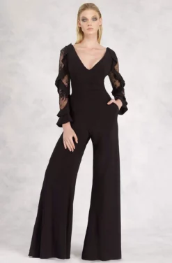 Wow everyone in this sophisticated creation by Janique K6598. This jumpsuit is designed with a V-neckline and has illusion detailed long sleeves to emphasize the overall appearance of this creation. The back has V-shaped detail that ends with a zipper closure. Another great creation by Janique.