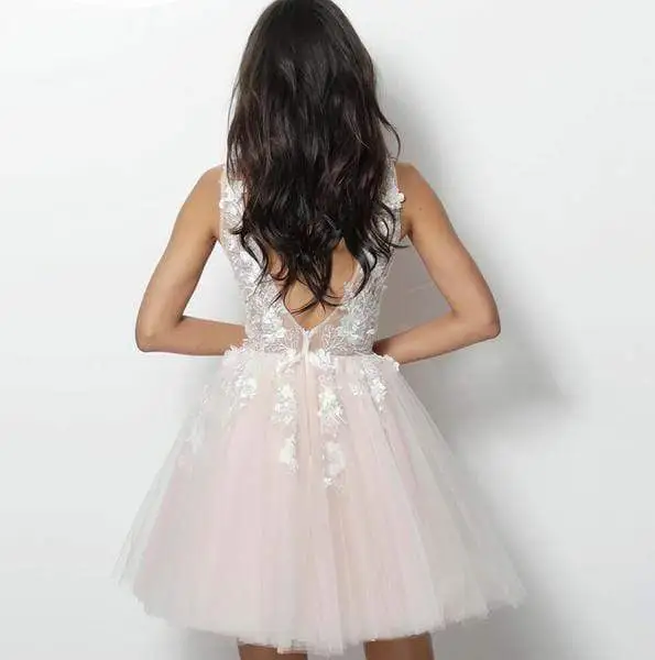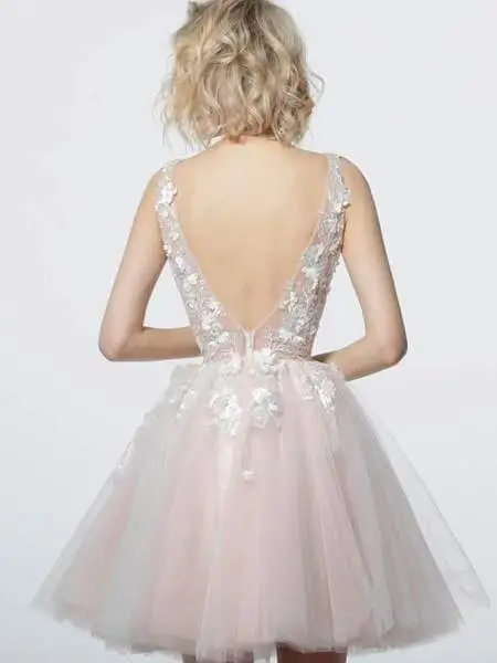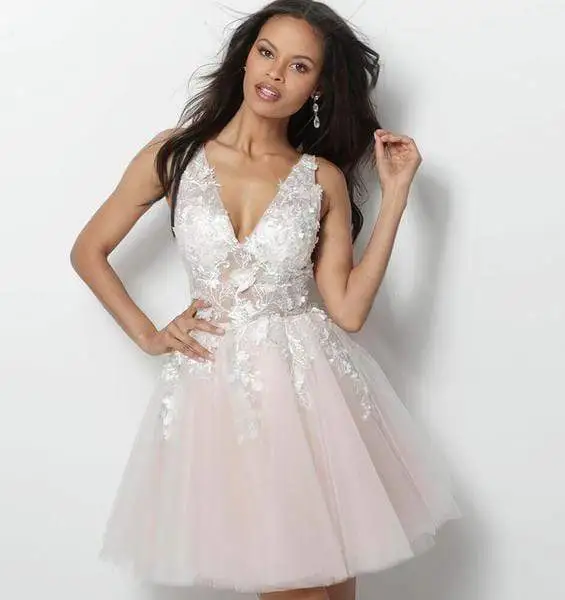 Be absolutely perfect in this lovely cocktail dress by Jovani 63987. This short part ensemble showcases an illusion bodice with a plunging V neckline, sheer side cutouts, and sexy V back. Beaded floral appliques adorn the bodice as it continues toward the top skirt of the a-line silhouette adding volume to the whole ensemble. Take their breath away with this superb Jovani creation. Models are wearing Off White/Light Blue and Off White/Blush colors