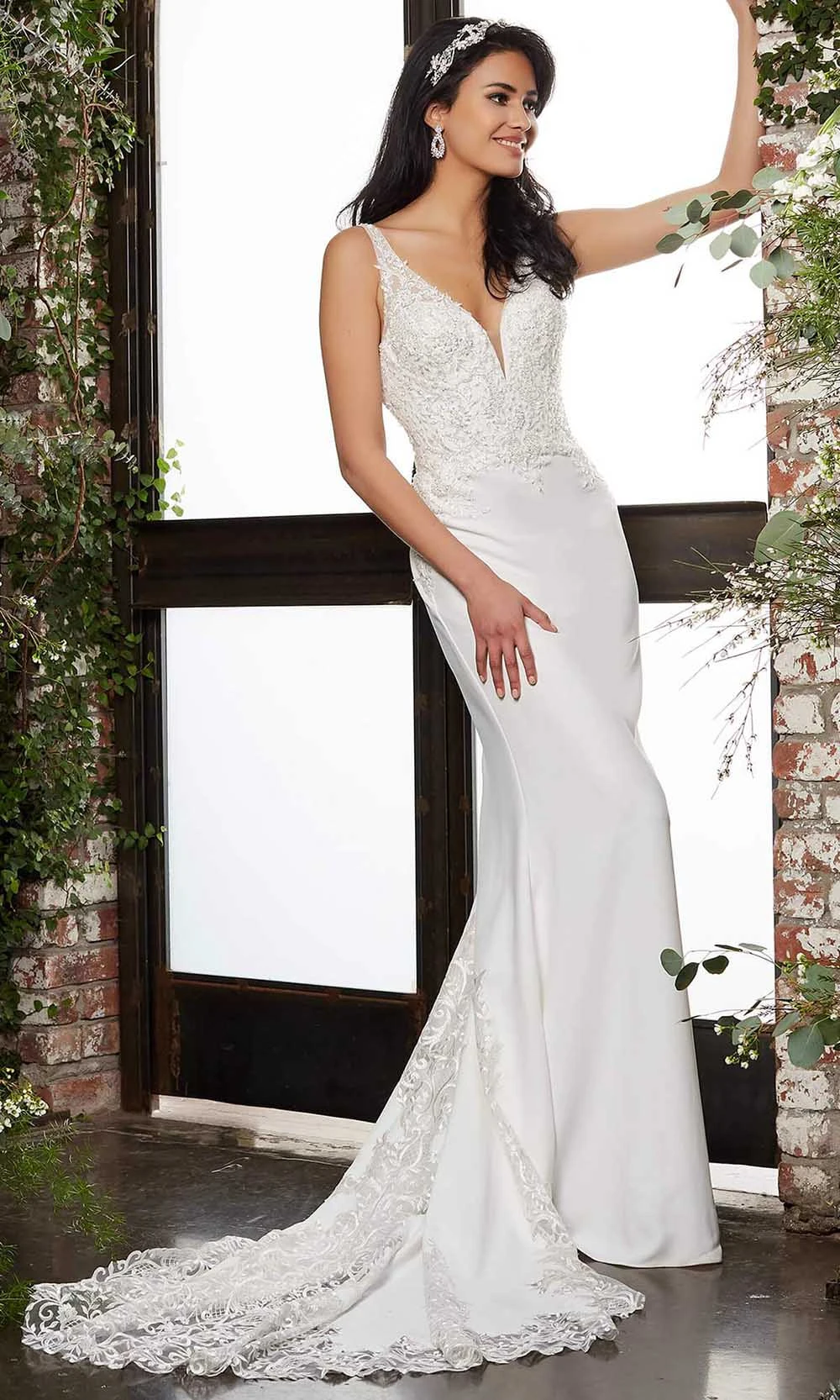 | Details: | Sleeveless, Beaded, Lace Details, Low V-Open Back, Button Details, Sheer Lace Paneled Train |
