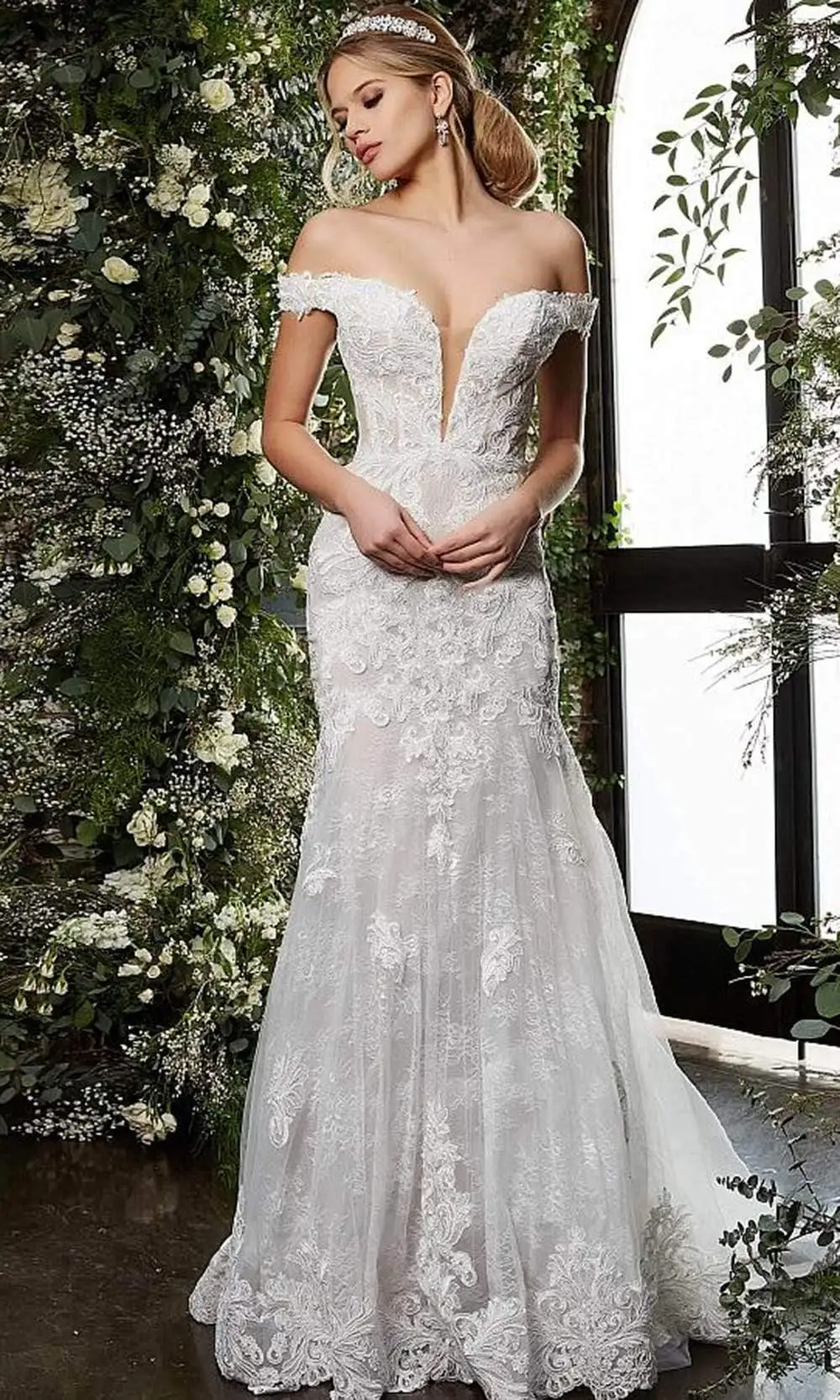 Sizzle and shine with this look from Jovani JB07266. Designed in beautiful lace, this long elegant gown features a deep off shoulder neckline with a form-fitting bodice. The skirt tapers at the thighs and flares at the bottom with a train finish. Beam with pride when you wear this radiant Jovani gown. Model is wearing Off-White color.