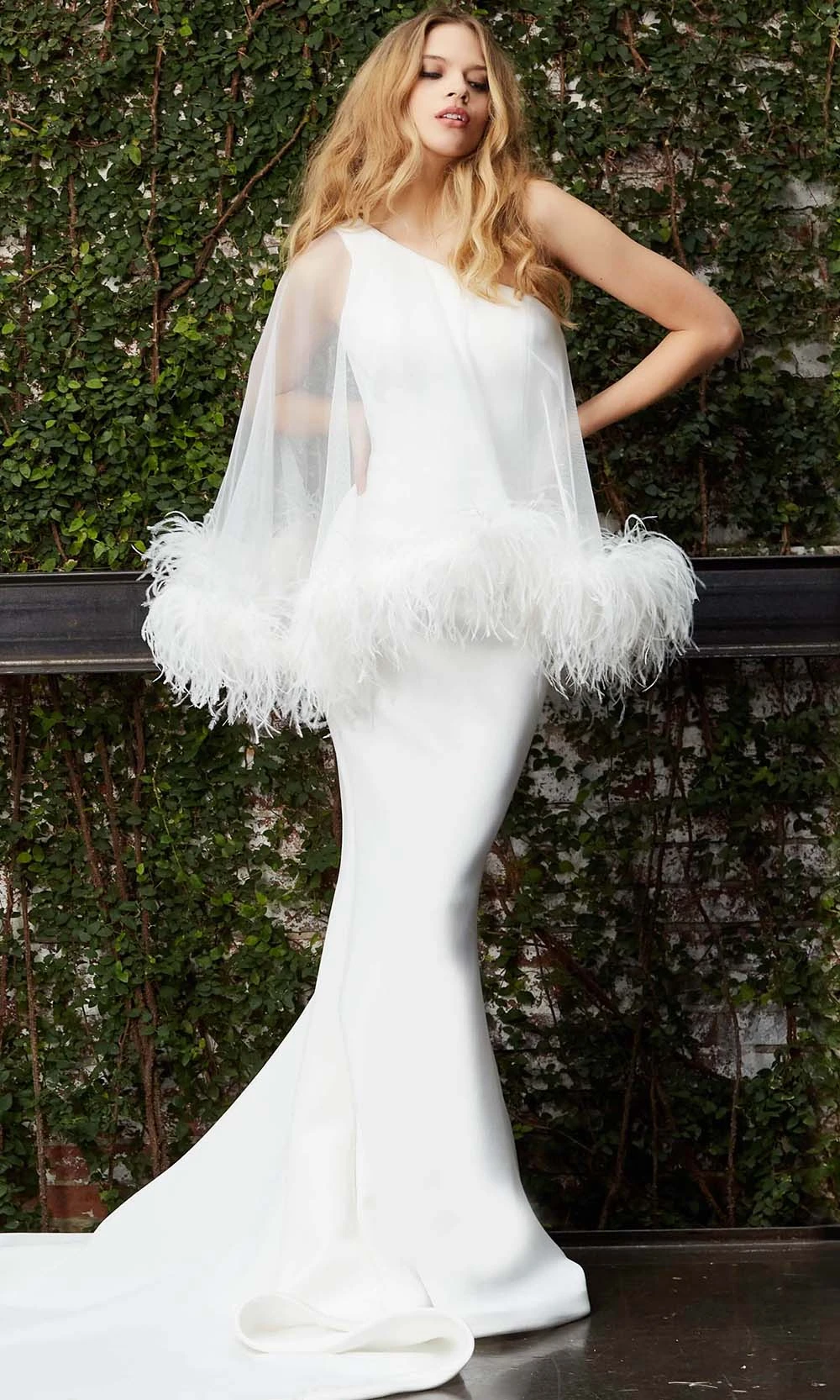 Don a style that is mesmerizingly feminine in this Jovani JB07360 bridal creation. Streaming with a sheer overlay and accented with feathered boa fringe detail, this gown reveals a one shoulder neckline. The mid-open back reveals button details as it flows into a mermaid silhouette with a court train. Saunter into the ballroom like a regal vision in this Jovani masterpiece.