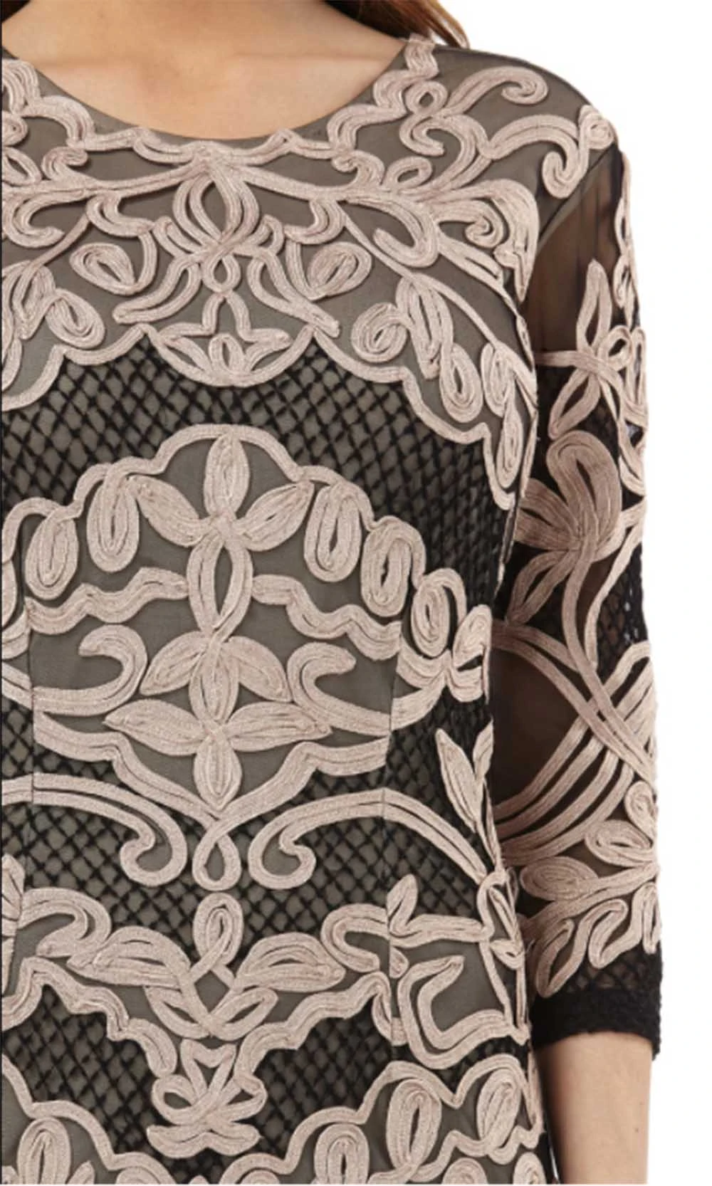 Look fabulous whether on a casual lunch soiree or a date night with your special someone in this London Times 866225 midi dress. This classy soutache embroidered mesh dress flourishes a jewel neckline and a full back with slender three-quarter length sheer sleeves. The skirt displays a sheath silhouette that falls to the knee hemline. Charm them all in this adorable London Times creation.