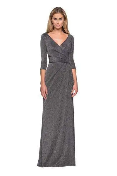 Class and sophistication are achieved in this sleek design by La Femme 26419. Brandishes in a plunging V-neckline with quarter length sleeves. Made of glitter jersey, the dress has a ruched bodice and the skirt flatters in a fitted silhouette in full length hem. Embrace a wonderful evening in this wondrous formal gown by La Femme.