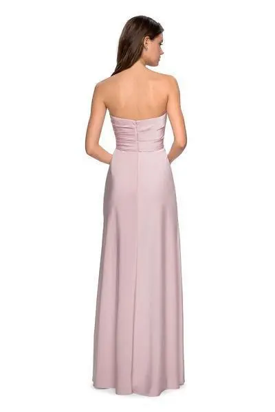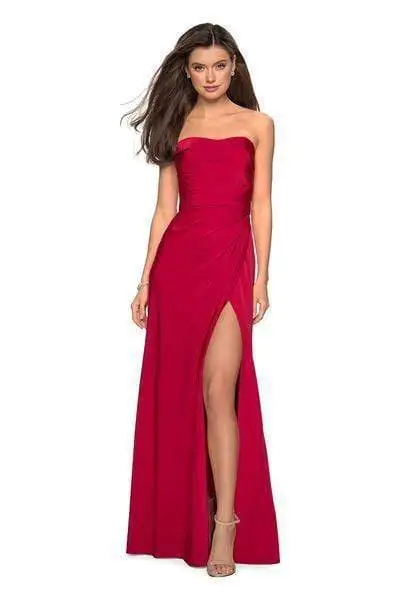 Create a picture-perfect moment wearing this elegant long formal dress by La Femme 26794. This charming style brandishes in a strapless fitted bodice with fine ruching details. The bodice features a modified sweetheart neckline and straight across mid open back with zipper closure at the center. The surplice style long skirt with fine asymmetrical pleats , opens at one side creating a flattering high slit to this sheath silhouette ensemble. You are statuesque in a posed gown from La Femme!