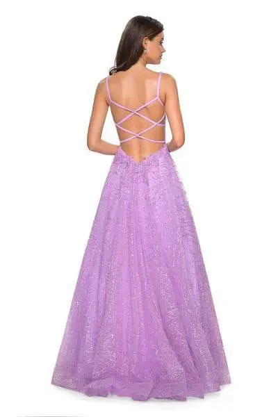 Shimmer with elegance and beauty while in this intricately designed La Femme 27719 creation. Festooned with floral lace appliques streaming down from a fitted bodice, this immaculate piece showcases a plunging sweetheart neckline with a sheer modesty inset. Creatively flaunting an intricate crisscrossing strapped detail at a plunging v-notched back, the lusciously sequined skirt flares down to create a lush A-line silhouette. Walk like an ethereal vision on the red carpet wearing this glorious La Femme masterpiece. Models are wearing the Cloud Blue, Lavender and Pale Yellow colors.