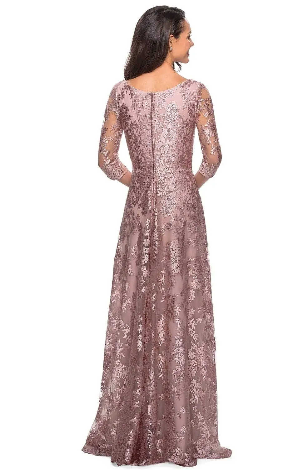 Showcase a magnificence like no other in this sleekly designed La Femme 27861 creation. Designed with an intricate gleaming lace motif on a sheer fabric, this piece shows a wide v-neckline with framing quarter sleeves. Fabricated with a slightly scoop back, the A-line skirt softly flutters in a stunningly adorned full-length hemline. Fascinate everyone from head to toe in this chic La Femme masterpiece.
