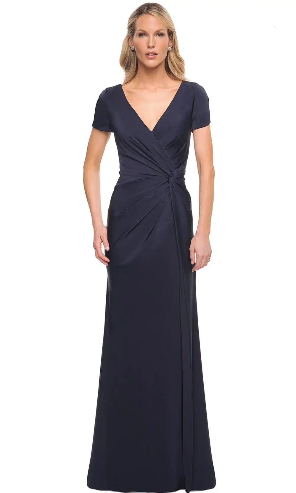 Show off your classy side in this stunning evening gown by La Femme 29926. This dress showcases a jersey column silhouette, with short sleeves and a full back. The asymmetrical waist emphasizes to the knotted top skirt, forming a gorgeous draping on the skirt that flows to a sweep train. Expect to be turning heads as you walk into your special event wearing this creatively romantic La Femme ensemble. Model is wearing Navy color. Whether you want an elegant minimalist long gown or an intricately embellished evening dress, La Femme dress collection can give you just the right dress you are searching for.