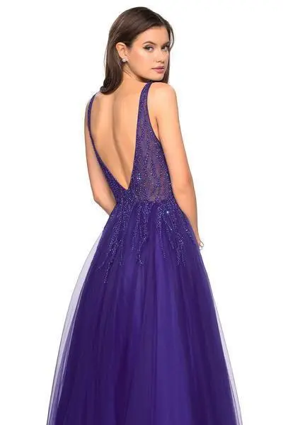 Brave the evening with dazzling beauty and grace wearing La Femme Gigi 27688. This sleeveless gown fashions a plunging illusion neckline with sheer mesh at the center for support and modesty style, and features sparkling rhinestone accents on the bodice, dripping down through the hips. Wide shoulder straps support the bodice, and frame the flattering low cut V shaped back. The full-length Tulle skirt has side pockets, and finishes at floor length. Exude a glittering appeal in this elegantly ornate La Femme Gigi masterpiece.
