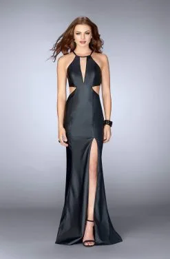 | Details: | Halter Neckline, Triangular Cutout on Bodice, Crisscrossed Strap Details on Low Open Back, Side Cutouts, Side Slit, Sheath Silhouette, Full-Length Hem, Sweep Train |