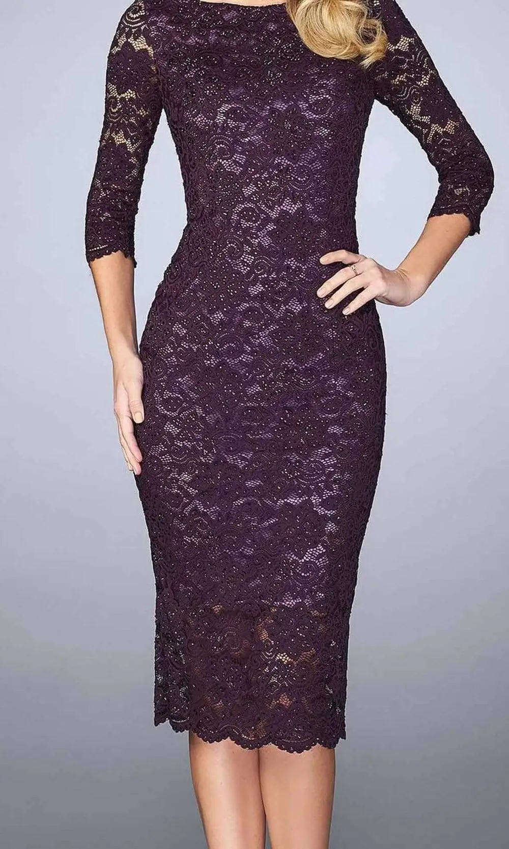 This dress showcases a lace quarter length sleeves and bateau neckline with lace overlay throughout the fitted bodice. The skirt is column-style with a modest scalloped hem.