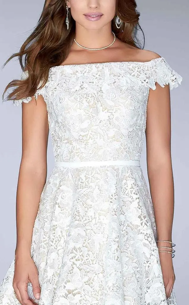 A flirty and fun lace dress with off the shoulder straps, perfect for a cocktail party or a cake cutting ceremony. Features a belt at the waist. Back zipper closure.