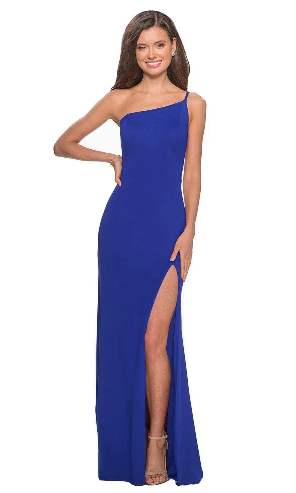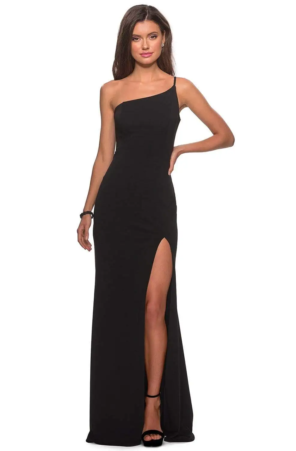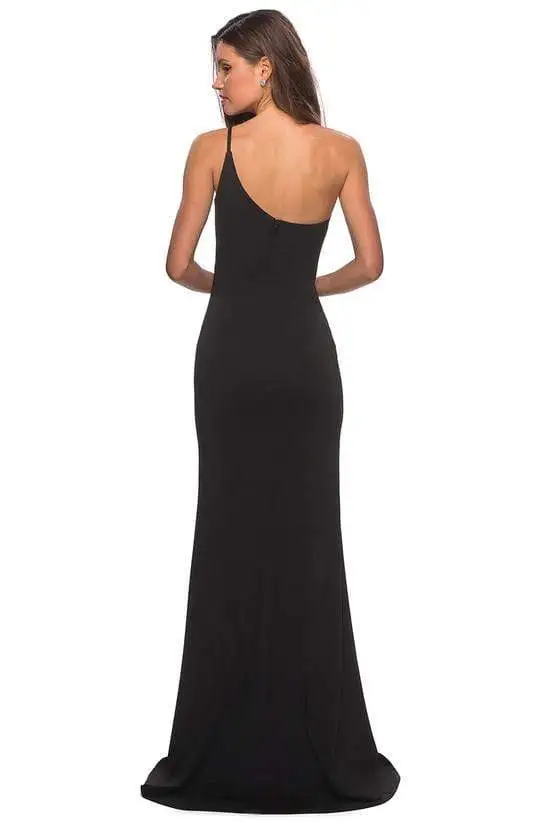 This solid jersey dress in fitted silhouette brandishes an asymmetric style neckline in a one shoulder fitted bodice and a scoop back. The full-length sheath skirt features a thigh-high slit to show off those sexy legs.