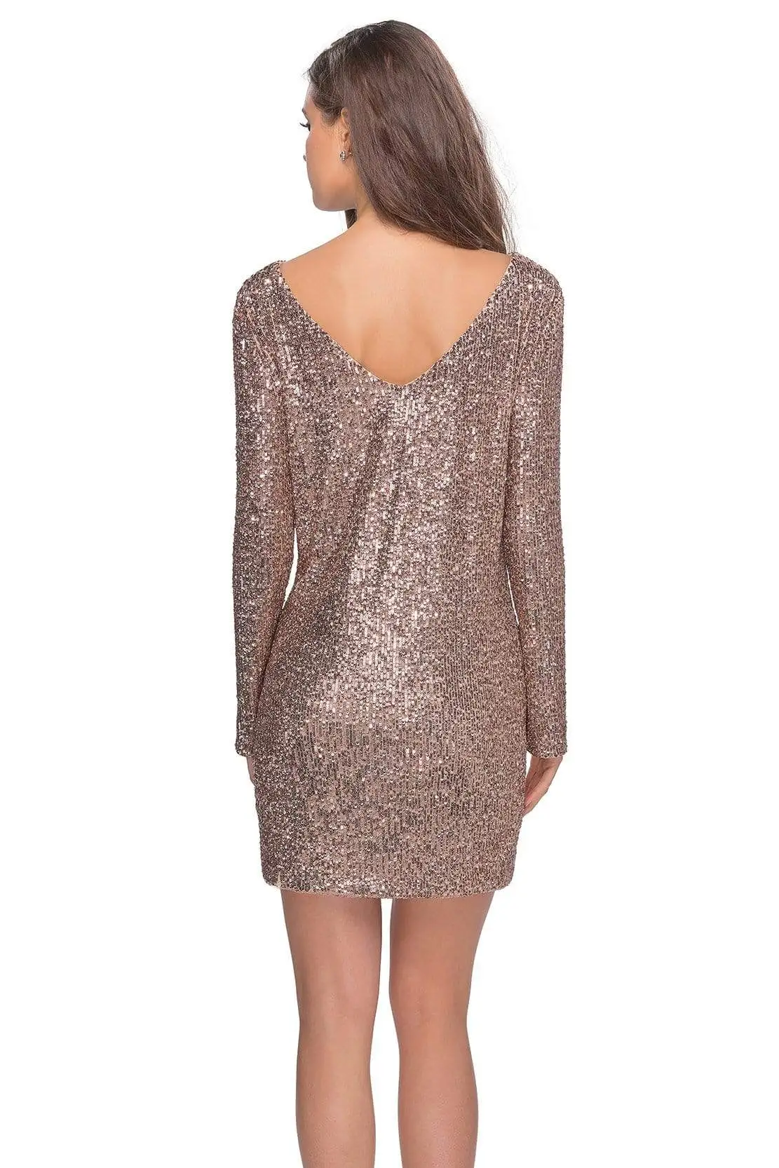 Made in allover sequin stretch knit, this slip dress shows off a bateau neckline with long slender sleeves. Designed with a modest V back, this sheath ensemble streams divinely down to a short hemline.