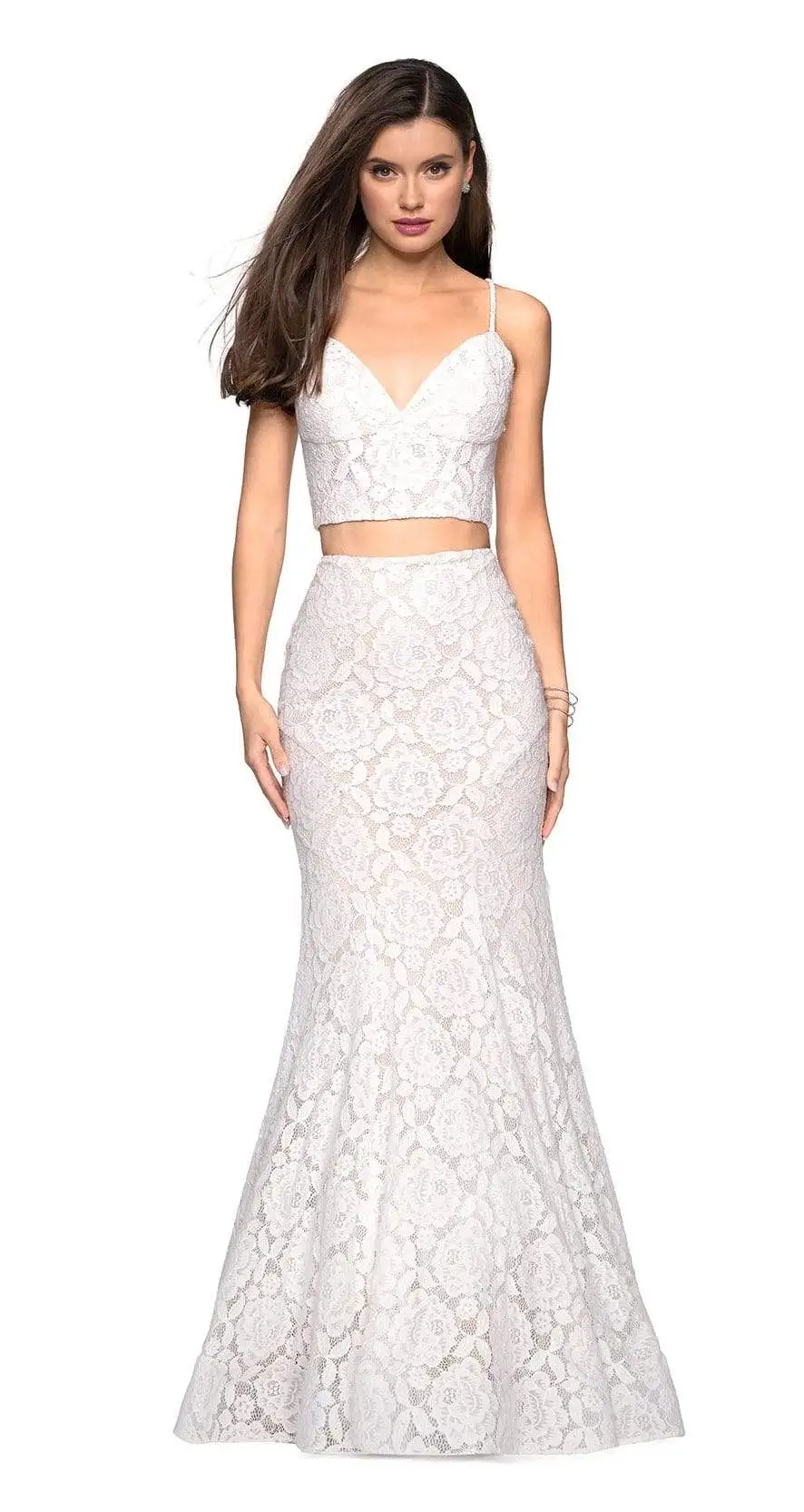 This two piece dress stuns in a sleeveless, sweetheart neckline crop top, crafted in lace and stretch jersey fabric. The skirt has a mermaid silhouette and runs at full length hem.