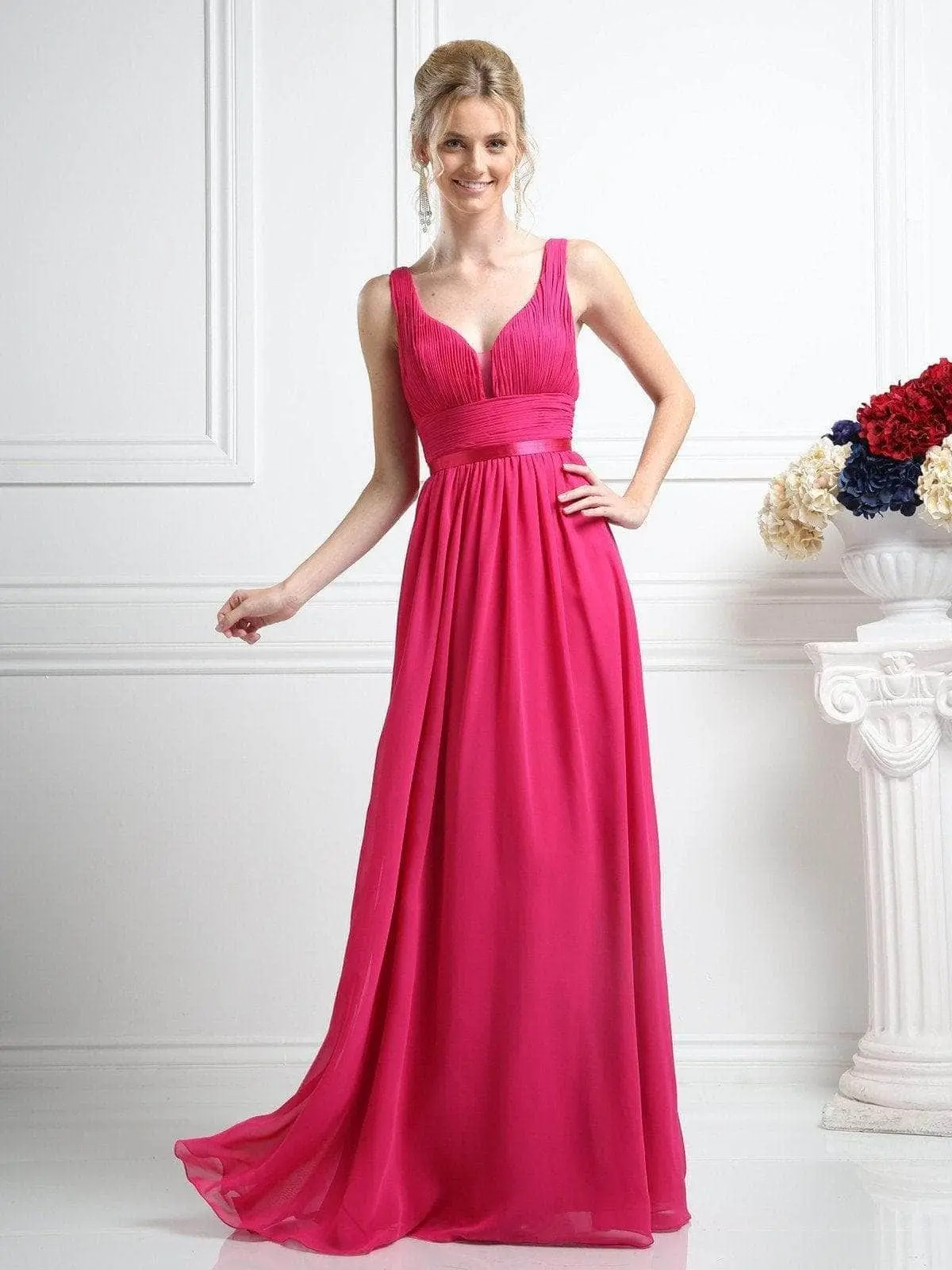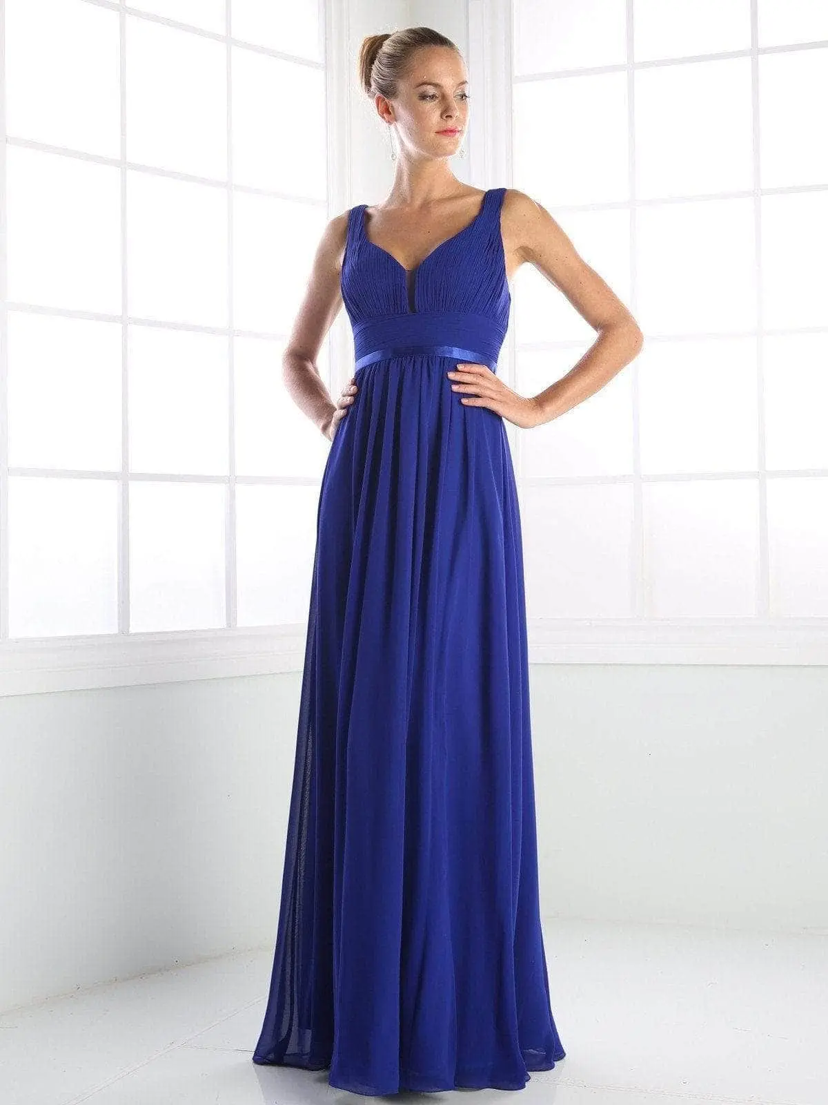 | Details: | Sleeveless, Chiffon, Shirred Bodice, Fine-Tucked Band, Illusion Inset, V-Cut Open Back, Back Zipper Closure, Satin Waistband, Full Length Hem |