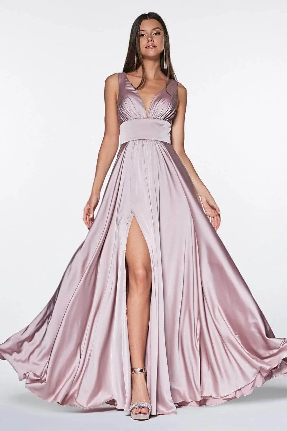 This fabulous design by Ladivine 7469 brings a striking look meant to turn heads. It is a full length gown, this elegant satin gown has a wide banded midriff with a ruched deep V neckline, a sleeveless bodice with wide tapered shoulder straps that lead to a low V shaped back. The A line skirt is long and flowy, with a sexy high slit on the right leg. A stunning choice for prom, semi formals or any occasion. Models are wearing the Black, Blush, Burgundy, Dark Mauve, Eggplant and Lavander colors.