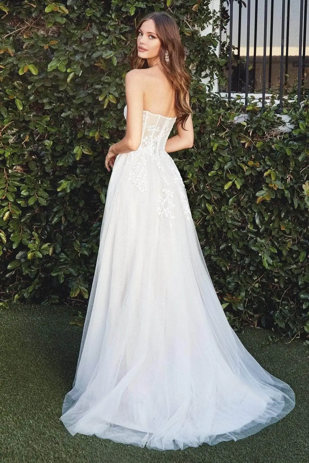 In this LaDivine CB065W bridal gown, radiance begins with you. You will be picture perfect in this strapless gown made with corset style bustier bodice gorgeously decorated with floral appliques. The gown has a pinched natural waist that leads to a tiered tulle A-line skirt with a stunning thigh-high leg split. When you turn up in this love-inspired gown from LaDivine CB065W, expect everyone to stop and gaze. LaDivine has your dress at the right value, whether you are looking for a distinctive prom dress to stand out, bridesmaid dresses or Mother of the Bride gowns for that special day, or just an evening dress for a memorable night out. LaDivine has your dress at the right value, whether you are looking for a distinctive prom dress to stand out, bridesmaid dresses or Mother of the Bride gowns for that special day, or just an evening dress for a memorable night out. The model is wearing Off White. Find more Wedding Dresses.
