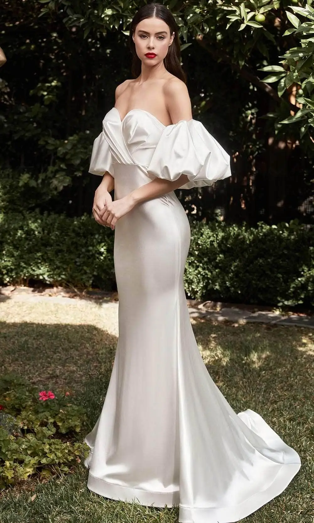 Weddings are full of emotion and joy, and it is completely possible to have your Ladivine CD984 dress embody those warm and fuzzy feelings. This simple yet bold gown charms with flawless seam line sculpted in fitted bodice, sweetheart neckline paired with big puffed sleeves, and cinch to show the natural waist. Going shopping for your wedding gown can be as intimidating as it is exciting but Ladevine bridal collection has you covered. You might consider this Ladivine CD984 if you really want to step outside the box with your ensemble. Model is wearing the White color.