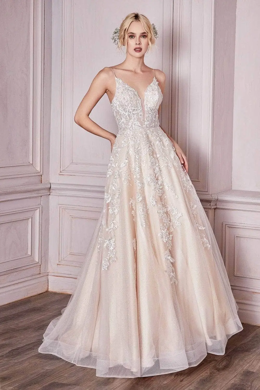 Look fresh and pretty in this simple yet elegant Ladivine CM320 bridal dress. This sleeveless bridal dress delights in a plunging V neckline bodice with spaghetti strap support, embroidered tulle on the bodice to the half part of the skirt, and an equally enthralling scoop shaped open back. An overlay of embroidered tulle gives fantastic volume to this ball gown wedding dress as it concludes with a sweep of train. For the elegant bride with a sexy side, the Ladivine CM320 is sleek, sophisticated and SO fierce perfect for a modern bride like you.