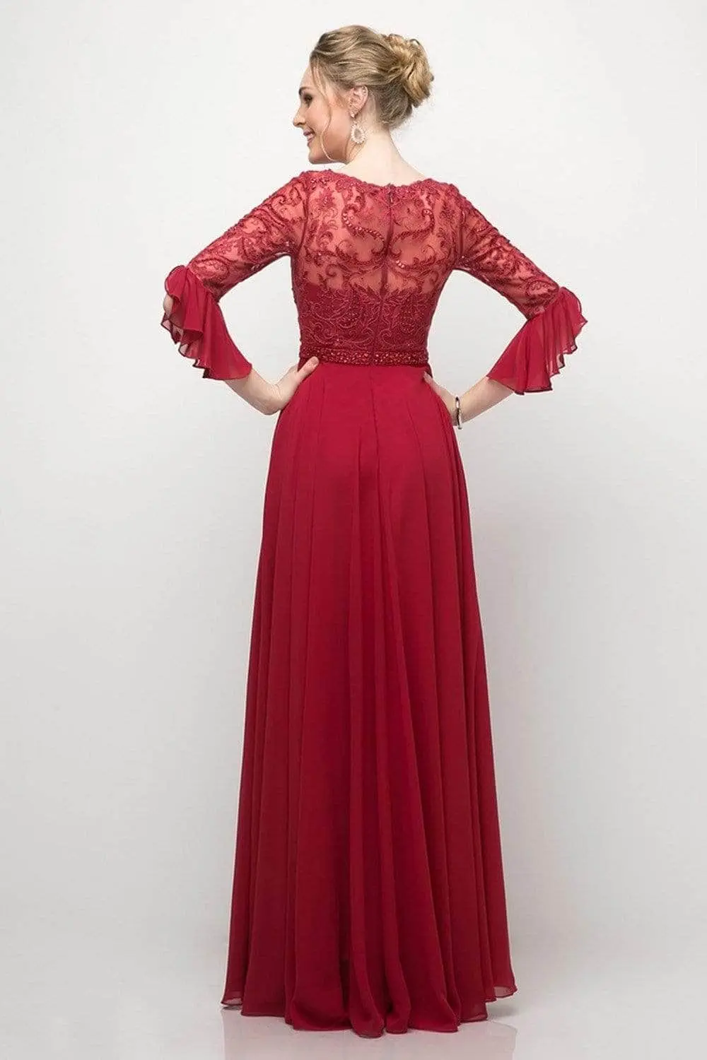 Wearing this absolutely stunning Ladivine CR781 work of art to your next event will undoubtedly be one of the best decisions you’ve ever made, and you’ll feel stunning the entire evening. This exquisite gown has an illusion bateau over a sweetheart neckline and is stunningly embellished with a beaded lace bodice. This look is defined by an illusion full back and embellished quarter sleeves with a fluttering flounce. On the chiffon A line skirt, a jeweled band encircles the natural waist and continues down to a full length hemline. Partygoers’ jaws will drop when they see you wearing this Ladivine CR781 masterpiece. The model is wearing the Burgundy and Teal colors.