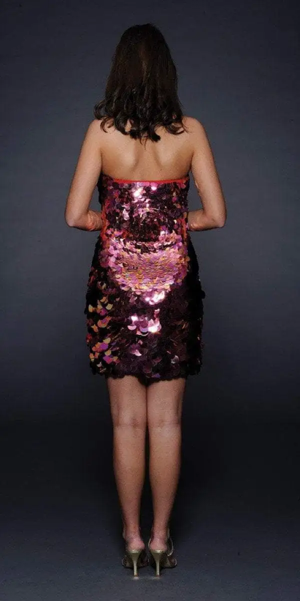 Look pretty as your party in this sparkling Lara 21570 design. This form-fitting strapless, mini-dress is made from dazzling fully sequined fabric. The fitted bodice is patterned with a straight neckline and a mid-back cut. A natural waistline unfolds to a mid-thigh length, tapered skirt that flatters your legs. Measured from hollow to hem, this dress is 33 inches.