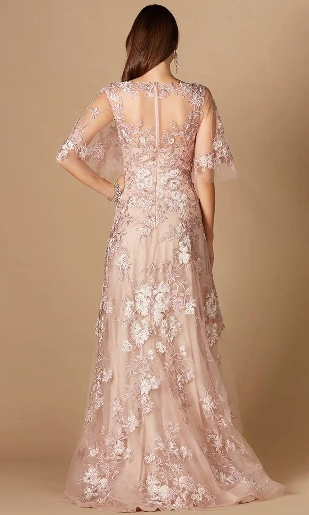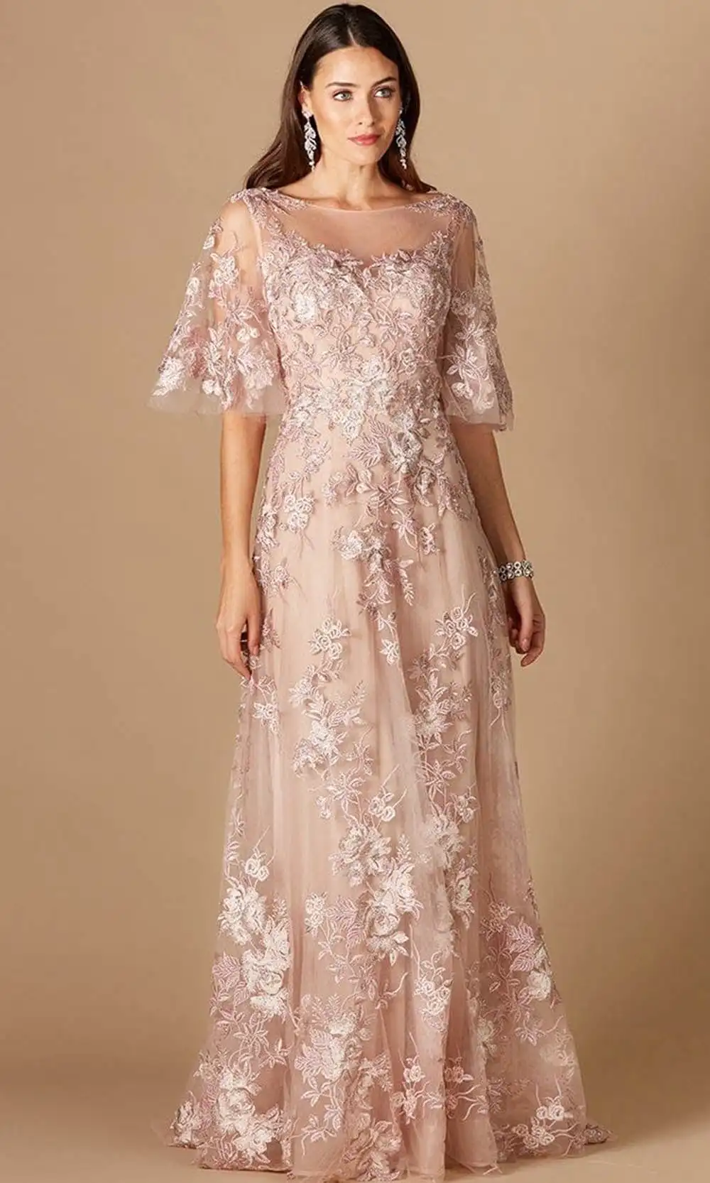 For a modest yet elegant appearance, this Lara Dresses 29325 is designed for the Mother of the Bride and Mother of the Groom. Exquisitely crafted in lace appliqued tulle, this stunner highlights a sheer bateau neckline over a sweetheart lined sleeveless fitted bodice, while the back showcases an enclosed semi-sheer style with a zipper at the center for closure. The elbow-length sleeves are styled in circular flounce while the A-line silhouette flares to a layered lace over satin jersey that gives the full-length hem its ampleness while concluding with a subtle brush of train. Beam with pride in this beautiful Lara Dresses creation. Handcrafted in perfection, Lara dresses will make you dazzle. If you want a stunning and elegant look, simply put on an exquisite Lara dress for a night worth remembering!