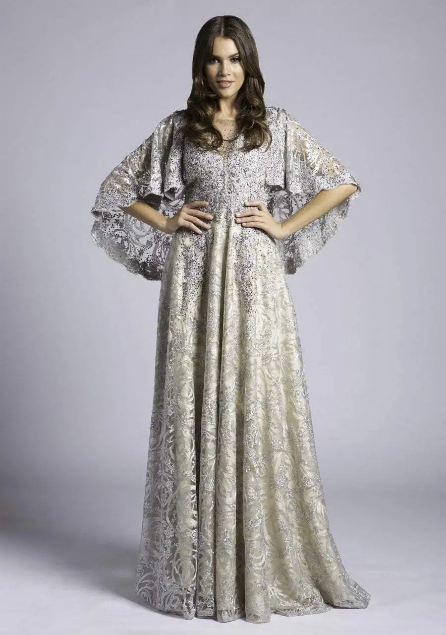 Scintillate with the elegance of ethereal goddesses in this fascinatingly ornate Lara 33492 creation. Sparkling with tiny jewels on stunning floral appliques, this gorgeous piece shows a display of delicate lace overlaying a nude lining. This ensemble presents a bateau illusion over a deep v-neckline as a cascade of scalloped edged fabric crafts sheer cape sleeves. Scooped at the back as glimmering stones shimmer down its silhouette, the A-line skirt flows softly in magnificent waves as it brushes down the floor with a sweep of train. Effortlessly stand out among the finest beauties of the night in this impeccable Lara masterpiece. Model is wearing the Silver color.