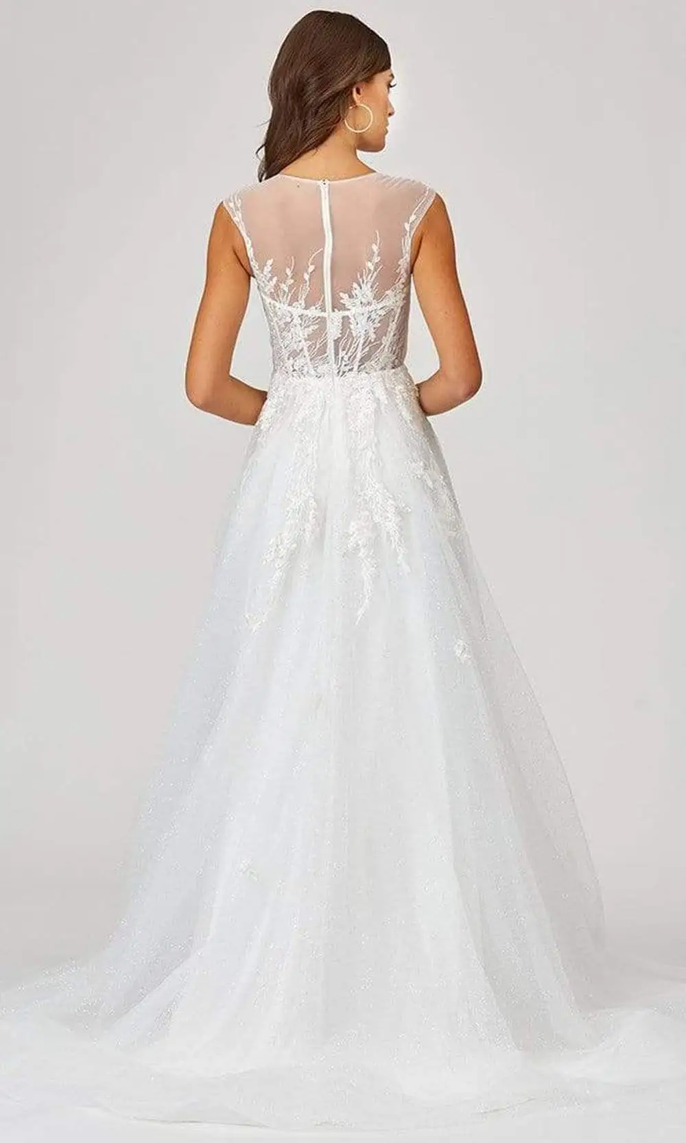 Exhibit exceptional style in this superb gown by Lara 51044. This lovely bridal gown showcases all over embellished lace over a sheer bodice with delicate boning and an illusion neckline. The skirt graces an a-line silhouette and finishes with a sweep train. Clothe yourself in creative couture with this stunning Lara dress.