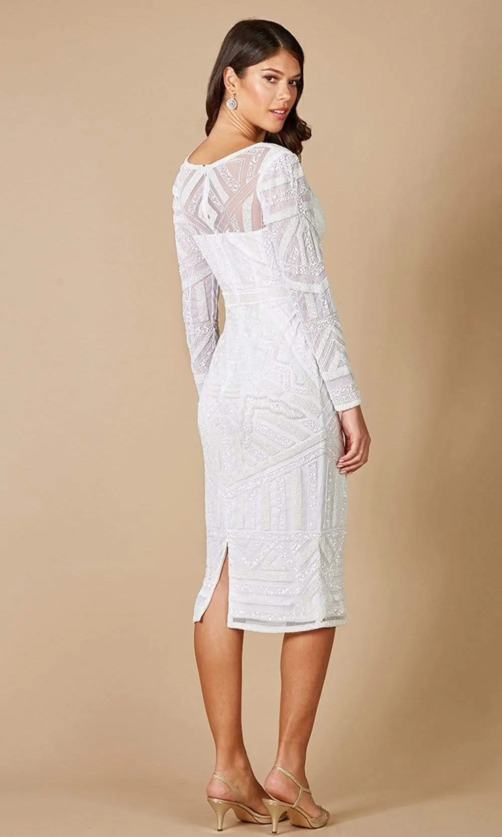 Render them speechless in this unconventional Lara Dresses 51076 bridal creation. Festooned with a geometric rendered embellishment, this piece reveals a v-neckline with long sleeves. Crafted with a sheer adorned back, the sheath skirt flaunts a back slit before skimming into a knee length hemline. Make your special day simply unforgettable in this Lara Dresses masterpiece.