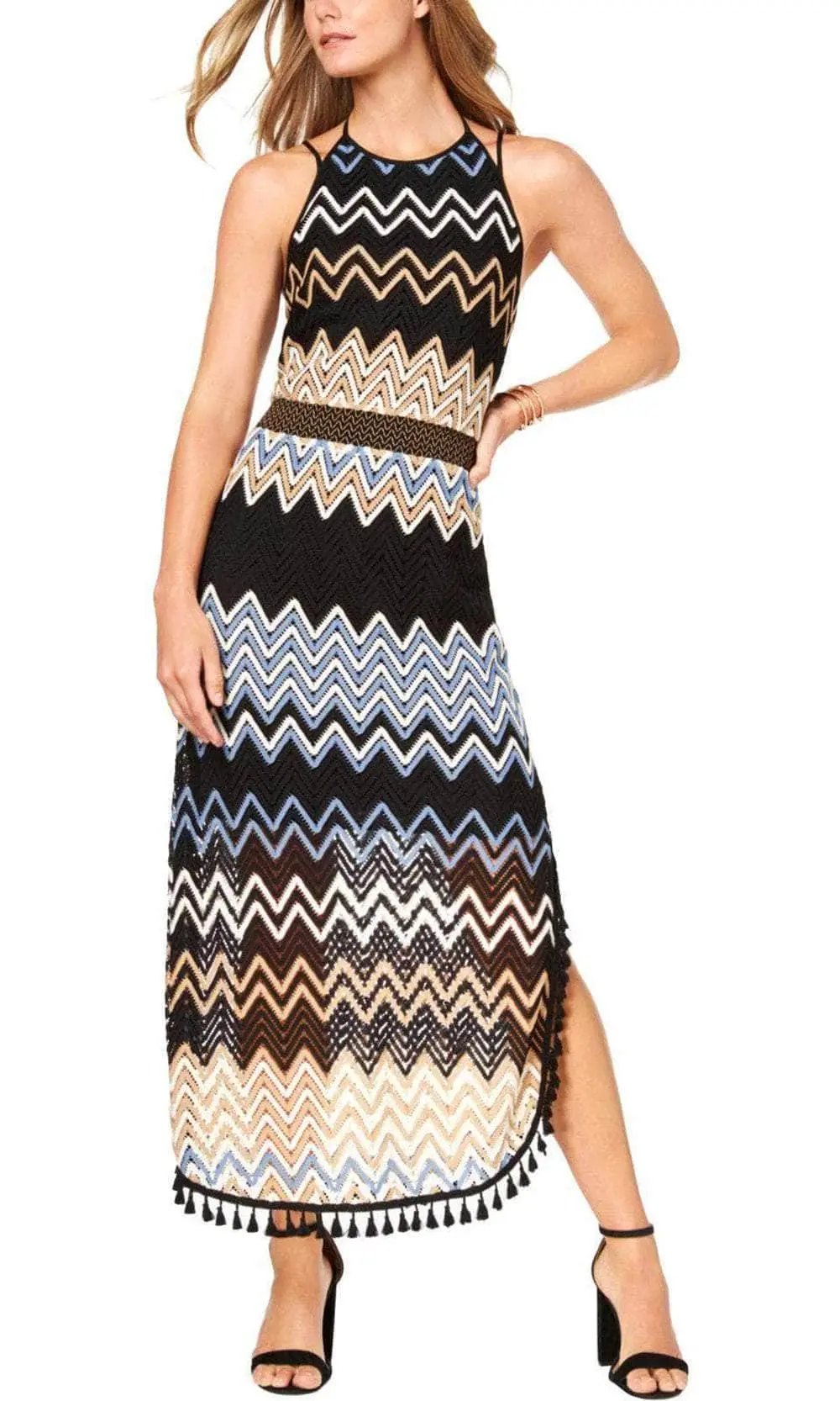 Be ready to fascinate everyone in this creation by Laundry 98M24305. Stunningly designed with chevron print throughout, this dress displays a sleeveless, halter neckline and spaghetti straps. Accented with a wide waistband and tie open back, the skirt tapers at full-length sheath silhouette with tassel detail on its hemline. You’ll be envied in an unbeatable dress from Laundry. Couture Candy is committed to provide the very best when it comes to dresses for every occasion, and we are delighted to have Laundry on our side to aid us in delivering exquisite dresses for various occasions that are sure to make heads turn. Model is wearing the Black color.