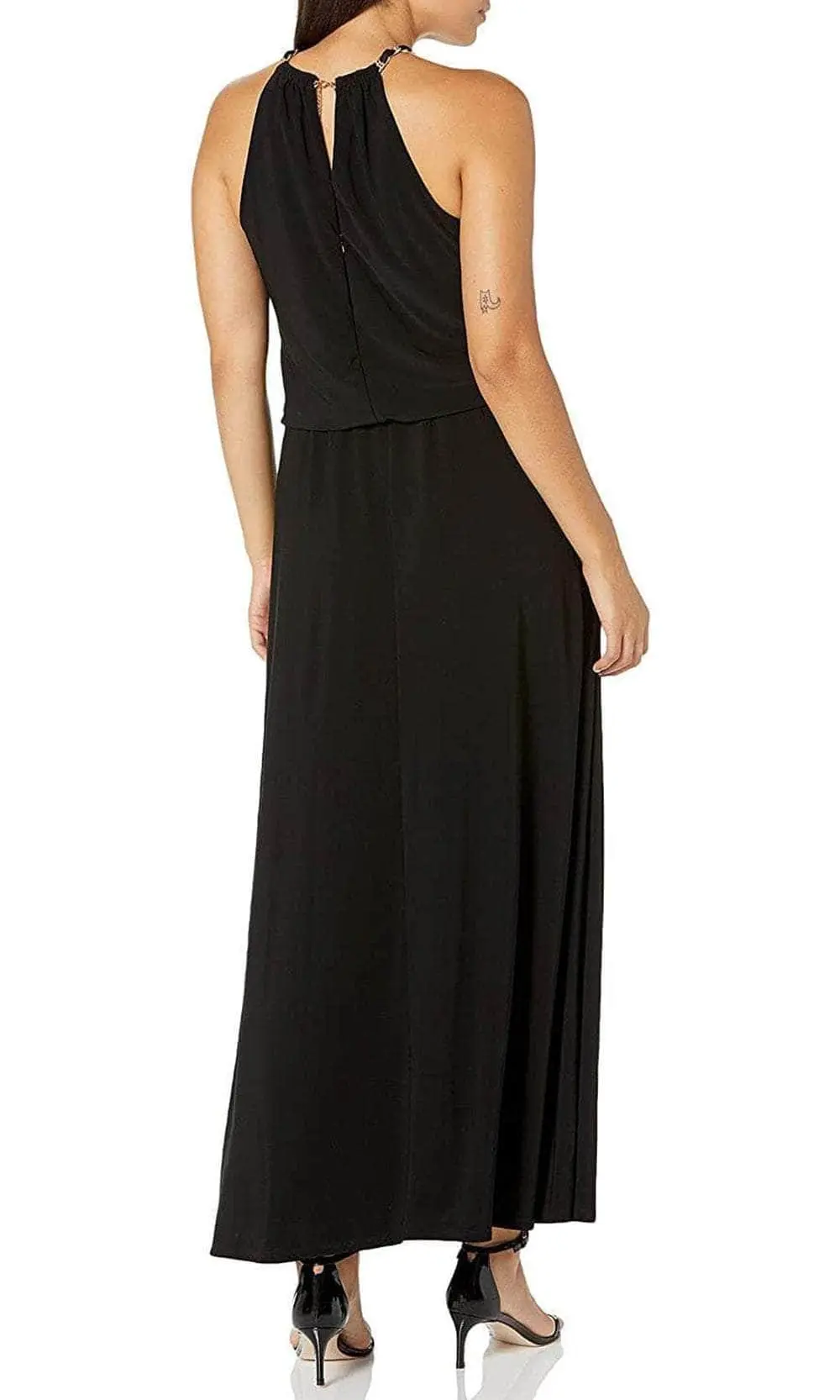 | Details: | Sleeveless, Ruched, Chain Detail, Blouson Bodice, Keyhole Back, Back Zipper, Full Length |