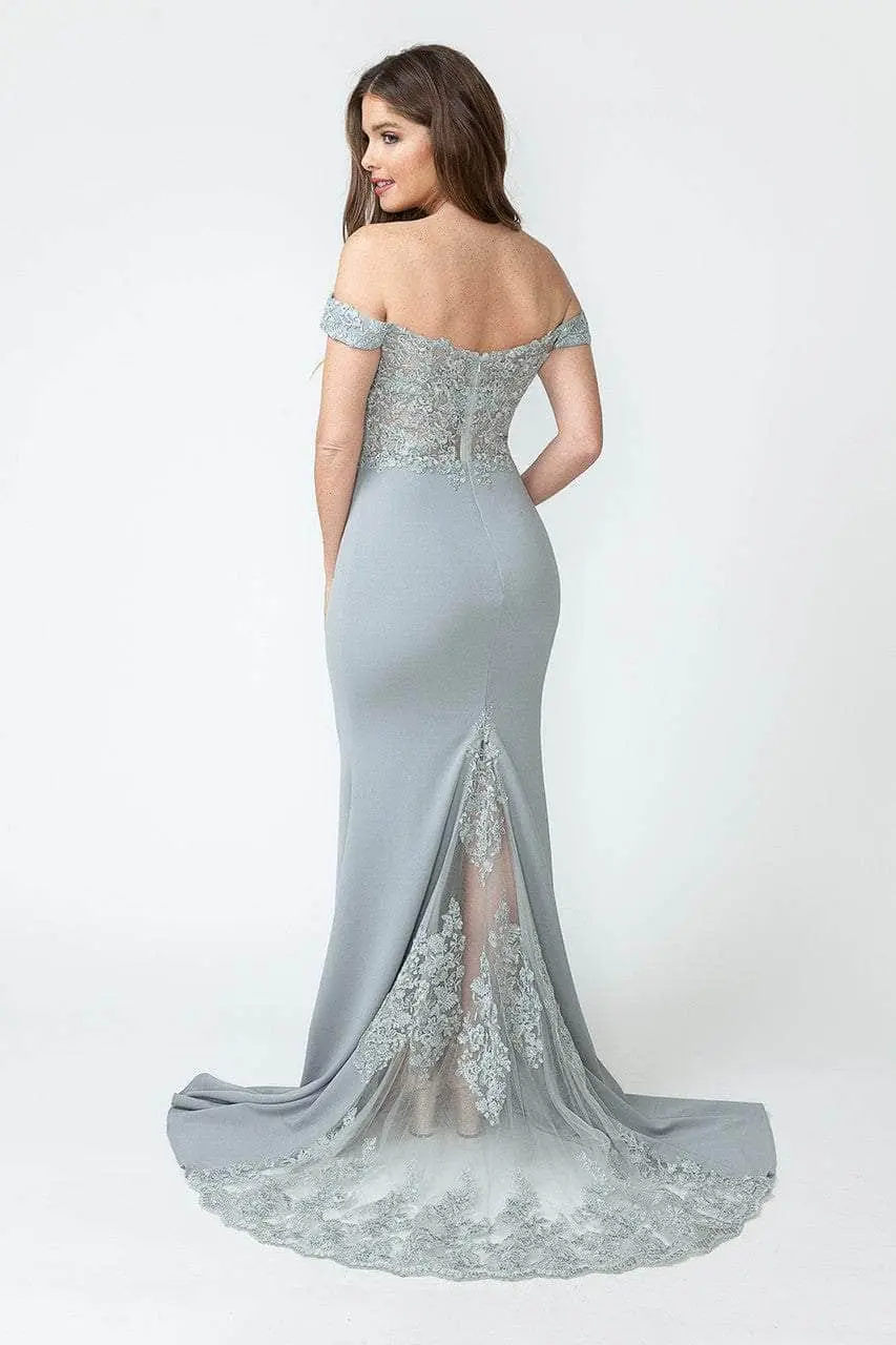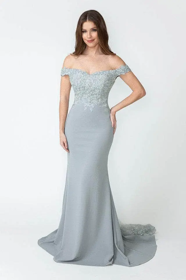 Promote attention-grabbing style in this stunning dress from Lenovia 8134. This long crepe dress charms in an off shoulder neckline with fitted bodice designed with beautiful embroidery. The skirt tapers at the thighs and flares at the bottom finishing with a sweep train. This Lenovia style is perfect for any formal evening.