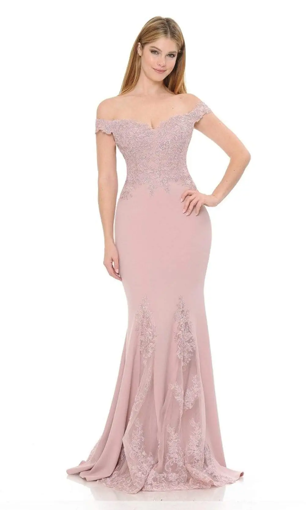 Be ready to fascinate everyone in this dress by Lenovia 8137. Appeals in an off shoulder neckline with an embroidered bodice. The skirt fits at the thighs and flares at the bottom. Get ready to shine in this fabulous Lenovia creation.